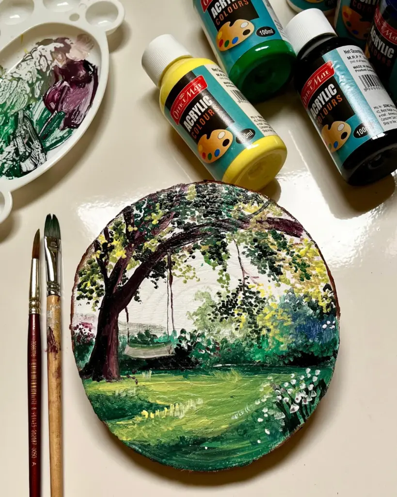 A scenic forest painting on a coaster is a fun way to practice layering and blending techniques.