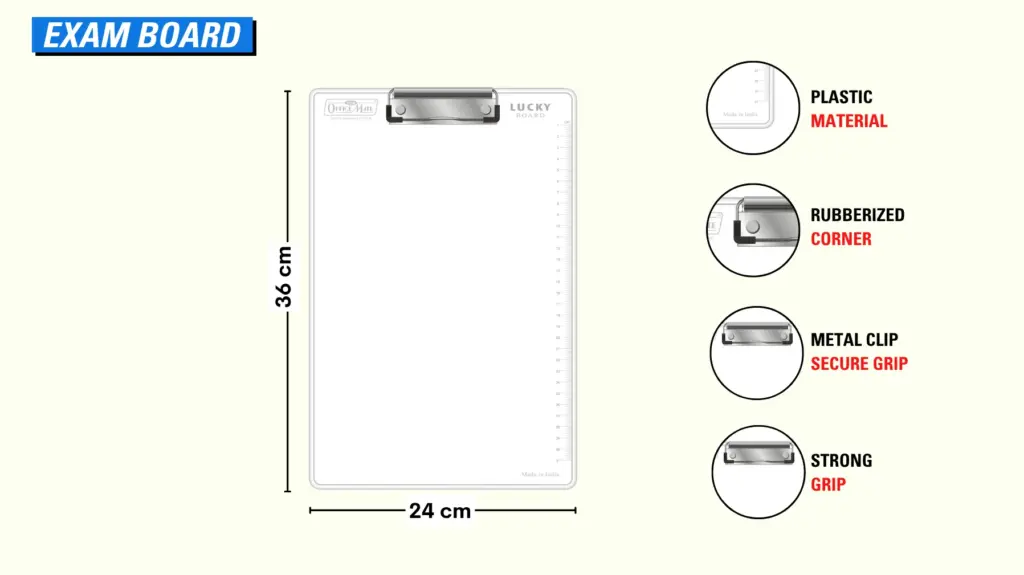 Made from high-quality plastic with a firm metal clip to hold papers securely. Lightweight and perfect for smooth writing during long exam sessions.
