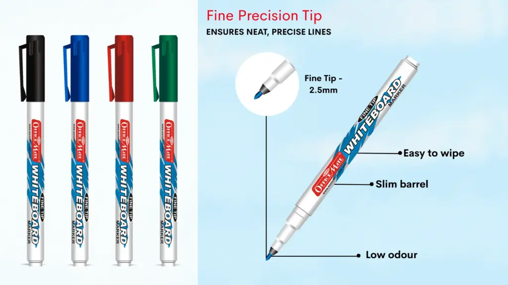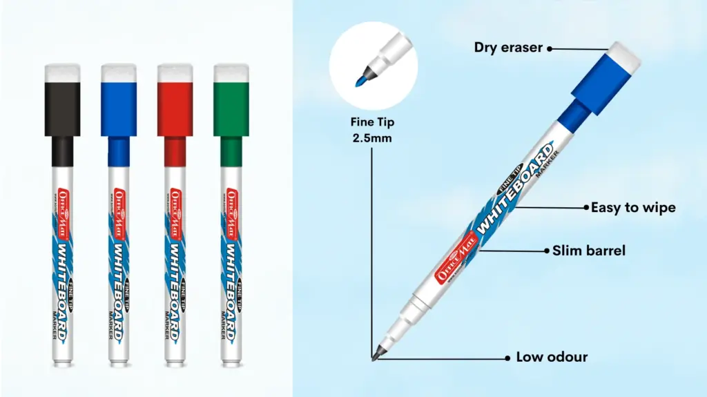 Write, wipe, repeat — all in one! This slim whiteboard marker comes with a built-in duster on the cap for quick corrections on the go.