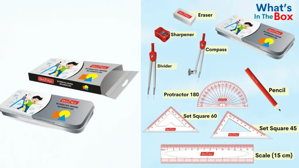 Everything you need for maths and diagrams — protractor, compass, divider, and more, all in a compact case.
