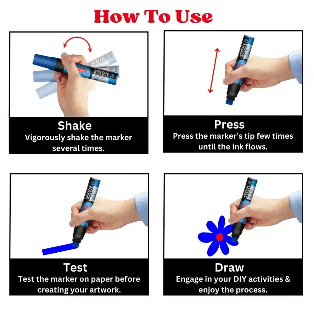 Get bold, vibrant colors with jumbo acrylic water-based markers, sold as a single marker or a set of 6 (Black, Blue, Red, Green, Yellow, White). Featuring a 15 mm chisel tip and a 3-in-1 nib design, these markers are perfect for detailed strokes and broad lines on murals, canvas, DIY crafts, and street art.