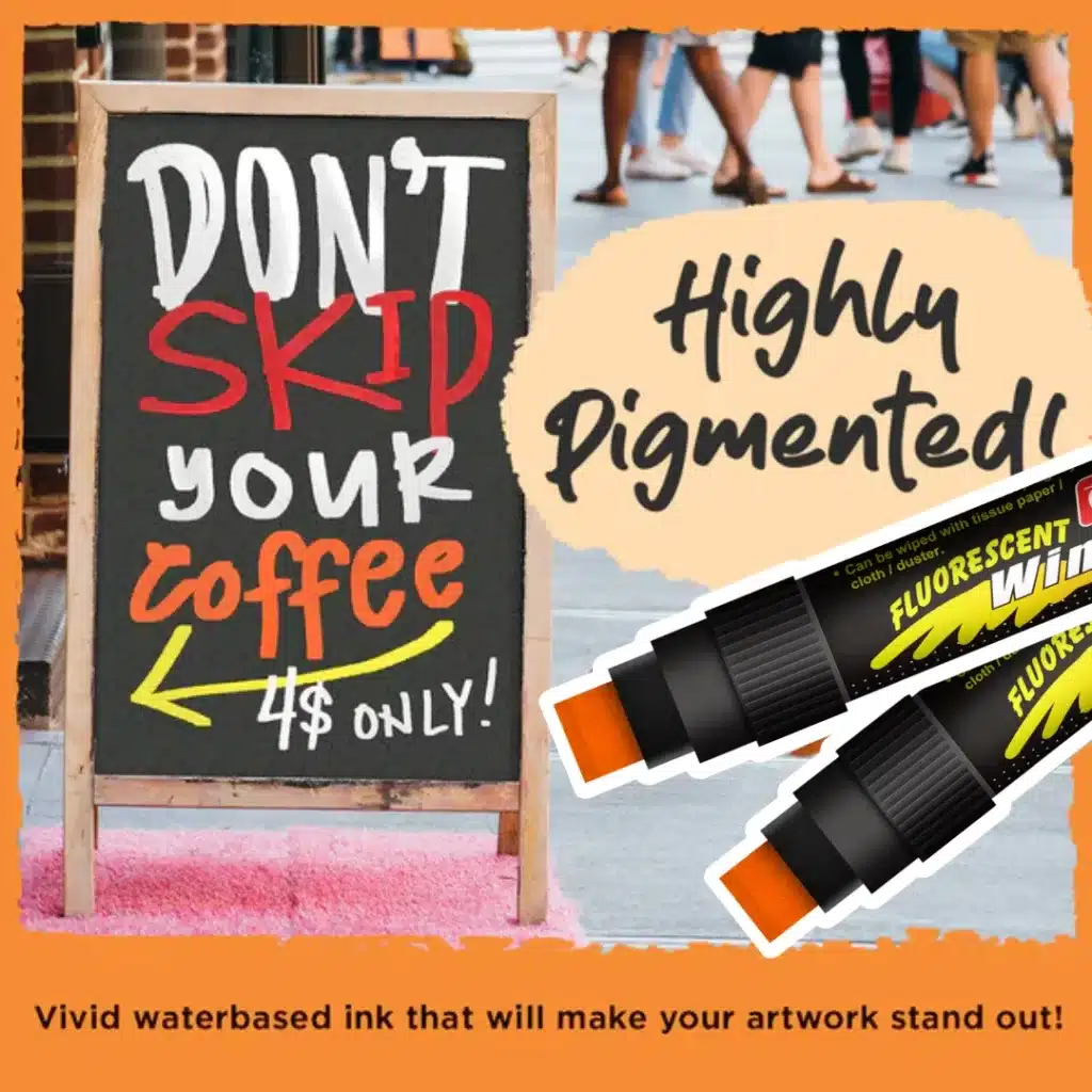 Brighten your displays with jumbo fluorescent window/chalk markers, available in a single marker or a set of 6 vibrant colors: Blue, Orange, Green, Pink, White, and Violet. Designed for use on glass, mirrors, and transparent surfaces, these markers offer bold, easy-to-erase designs.