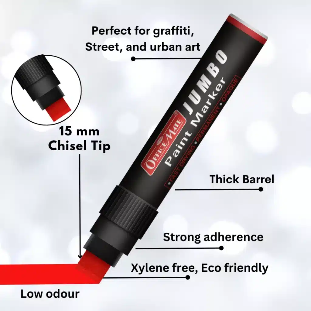 Experience vibrant, permanent designs with jumbo paint markers available both as a single marker or a 6-piece set in Black, Blue, Red, Green, Yellow, and White. Each marker features a 15 mm chisel tip with a versatile 3-in-1 nib for wide, bold, and fine strokes, perfect for graffiti, street art, murals, and urban projects.
