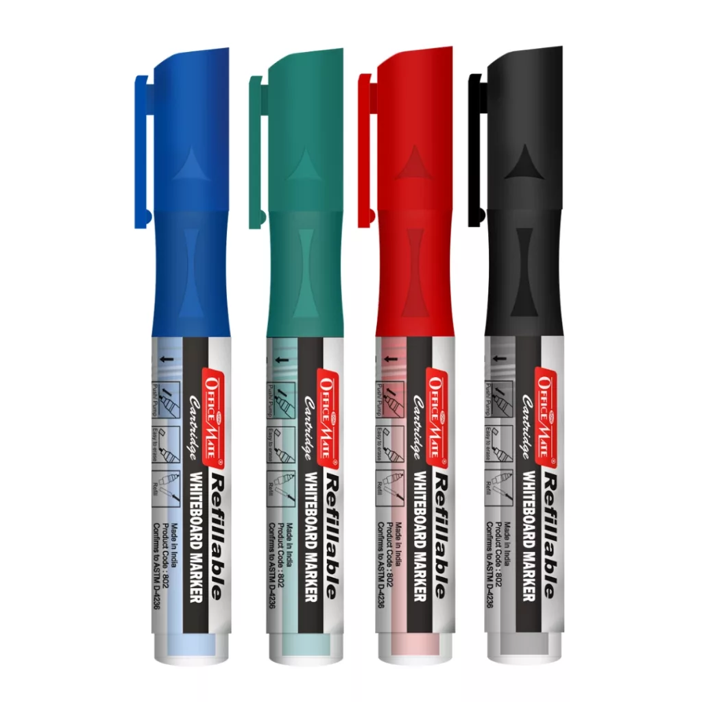A pack of four vibrant-colored markers, these come with a refillable cartridge for sustainable and cost-effective use. The smooth ink application ensures clear writing and easy cleanup, and the non-toxic, low-odor ink makes them safe for classrooms and offices.