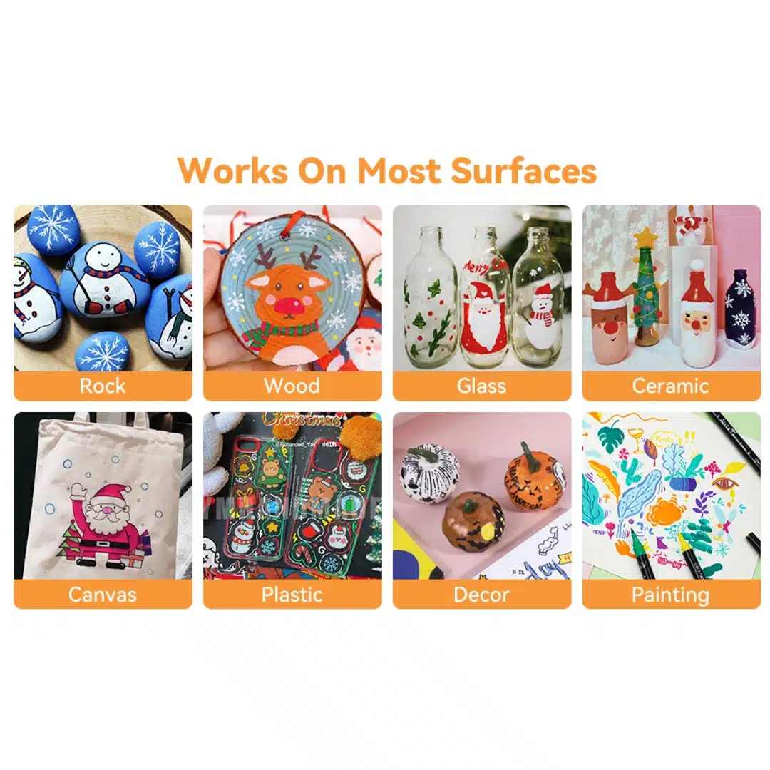 Indeed, our acrylic paint markers work on nearly any surface and are incredibly adaptable. They stick to smooth surfaces like plastic, metal, and glass and look great on wood (used for crafts and rock painting) and canvas. They can even be used as decorative elements on leather or fabric (although we advise sealing the design or using a suitable fabric marker on fabric that will be washed). The opaque acrylic ink adheres well to both porous (wood, canvas) and non-porous (glass, ceramics) surfaces, especially after it has completely dried.
