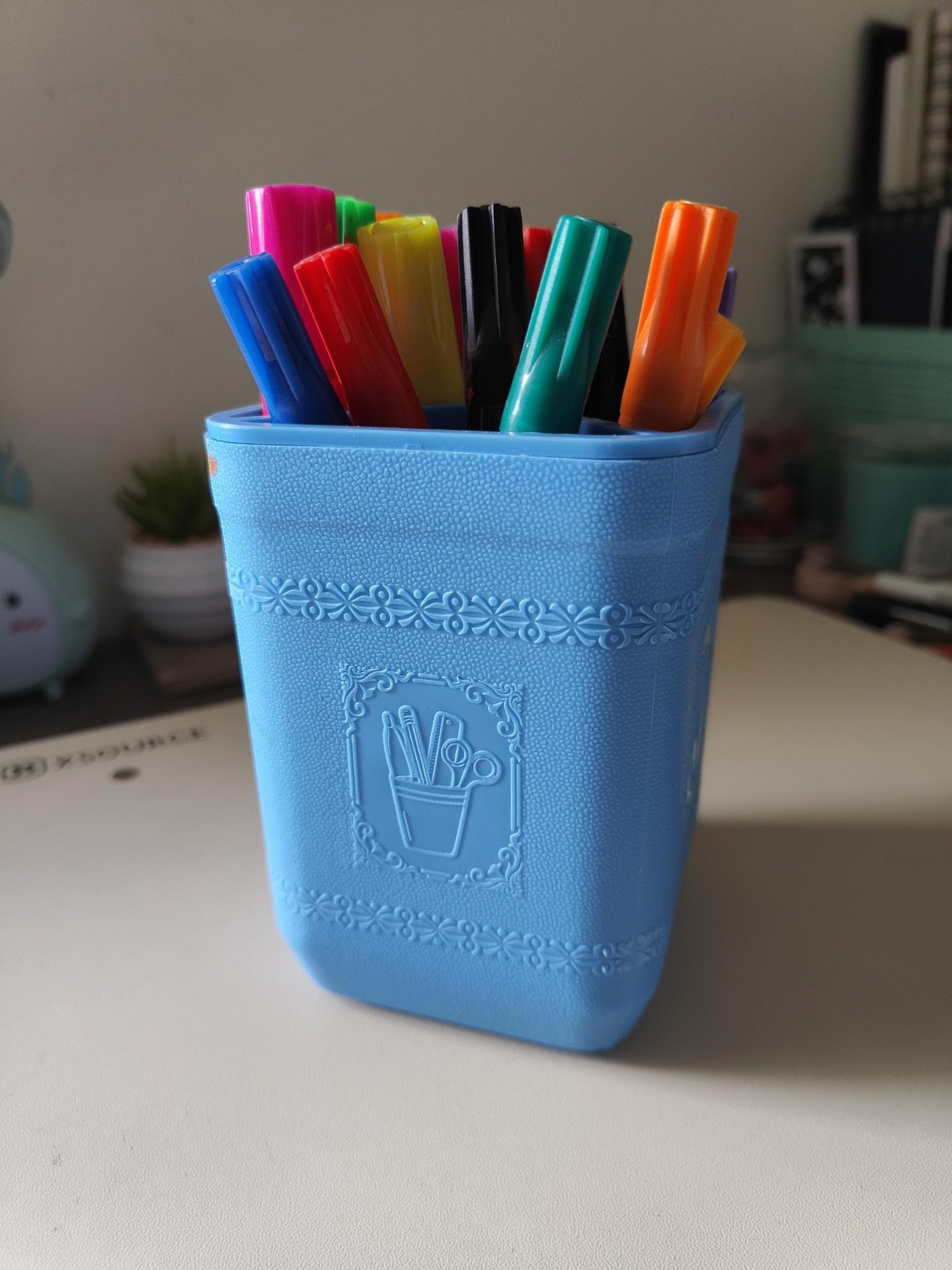 Yes, the pen stand has a little more functionality than just being a cup. It has two shallow compartments built into the upper rim. You can store things like push pins, paper clips, and erasers in these tiny trays or "attachable heads." They resemble handy dishes on top for small items you want easy access to, rather than deep pockets that reach all the way to the bottom of the stand. Your pencils and pens are kept in the main body. In this manner, it assists in keeping your writing implements and those small desk accessories that are otherwise disorganised.
