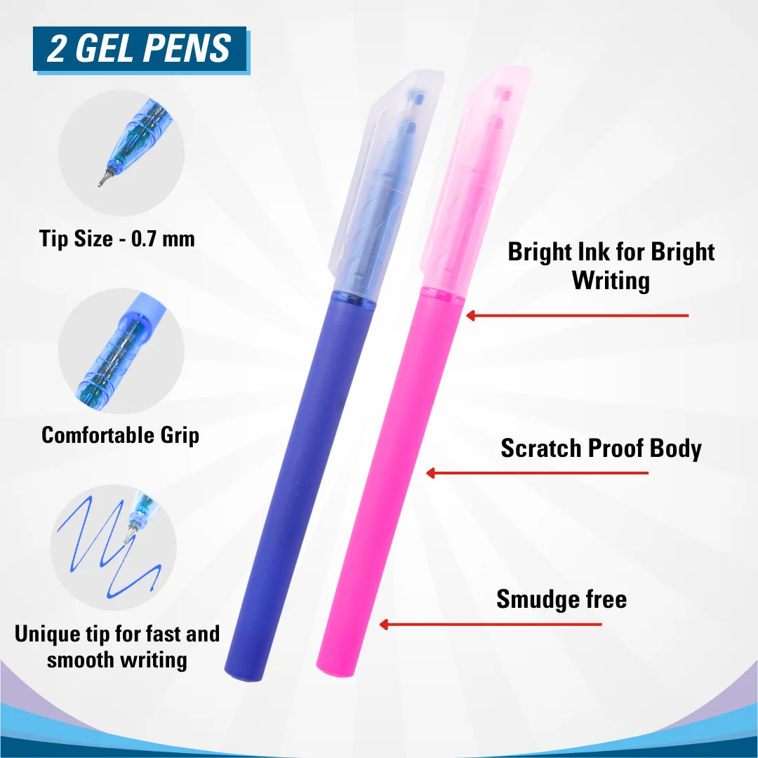 10. 2 Gel Pens: Tip size of 0.7 mm with a comfortable grip, designed for fast and smooth writing. Features smudge-free, bright ink and a scratch-proof body.