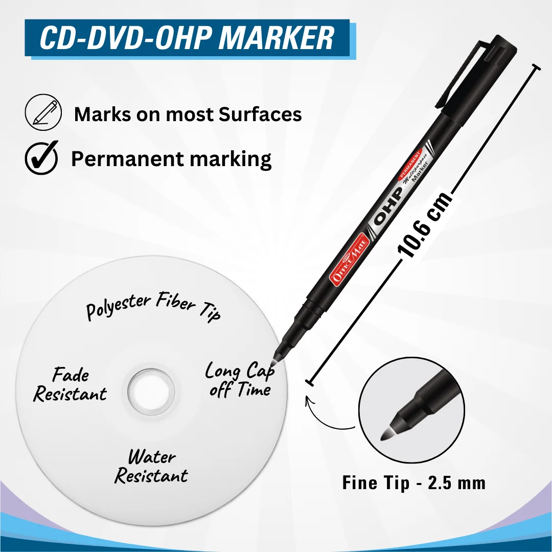 4. CD/DVD/OHP Marker: Marks on most surfaces with permanent, fade-resistant, and water-resistant ink. Features a fine 2.5 mm polyester fibre tip, long cap-off time, and measures 10.6 cm.