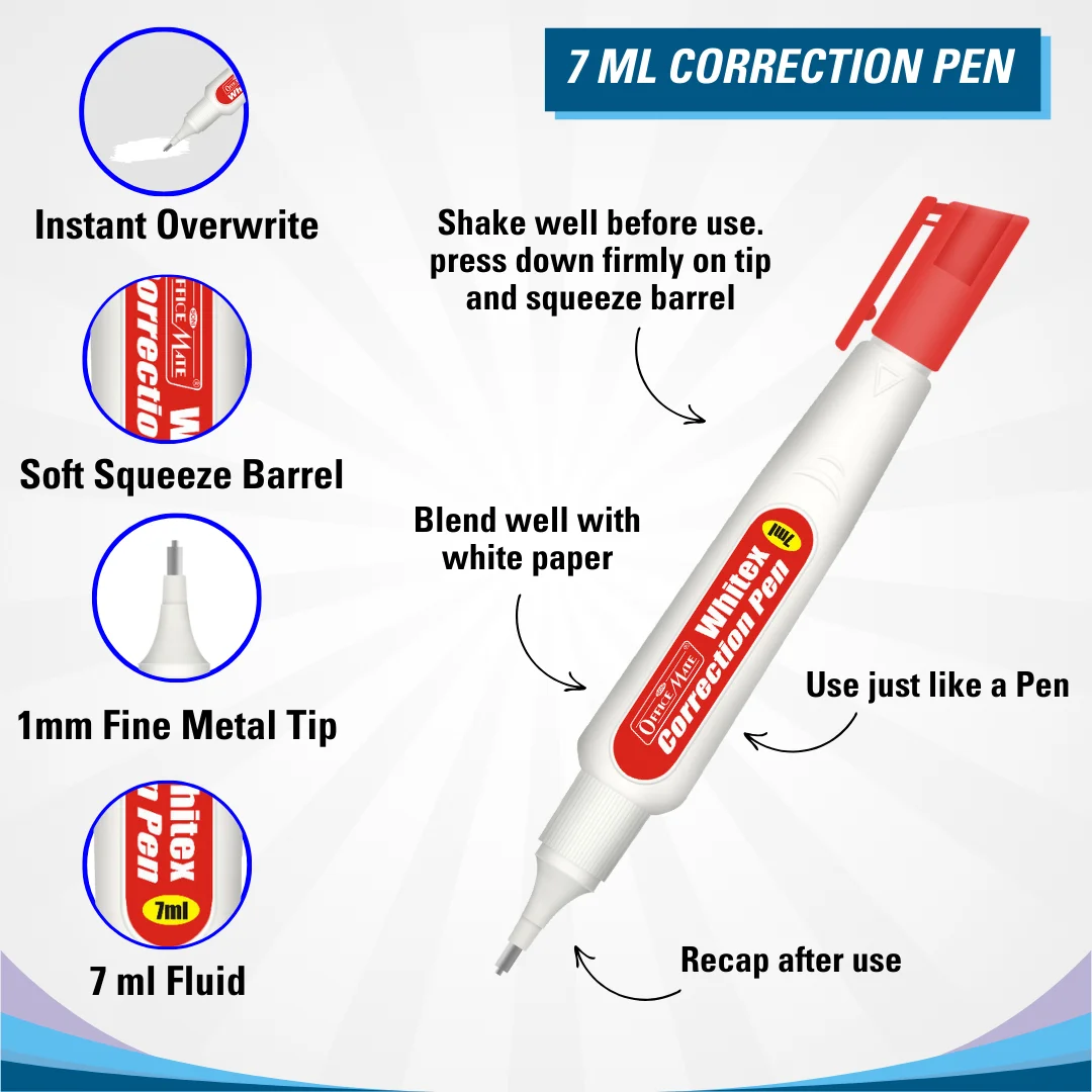 3. Correction Pen (7 ml): Soft squeeze barrel with instant overwrite capability, featuring a 1 mm fine metal tip for precise corrections.
