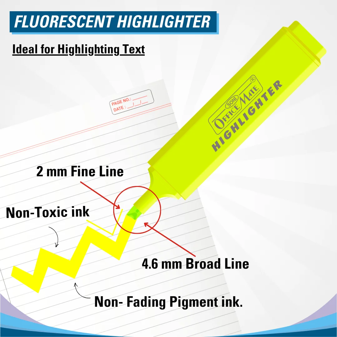 2. Fluorescent Highlighter: Ideal for highlighting text with non-toxic, non-fading pigment ink, featuring dual tips with a 4.6 mm broad line and 2 mm fine line for versatile use.