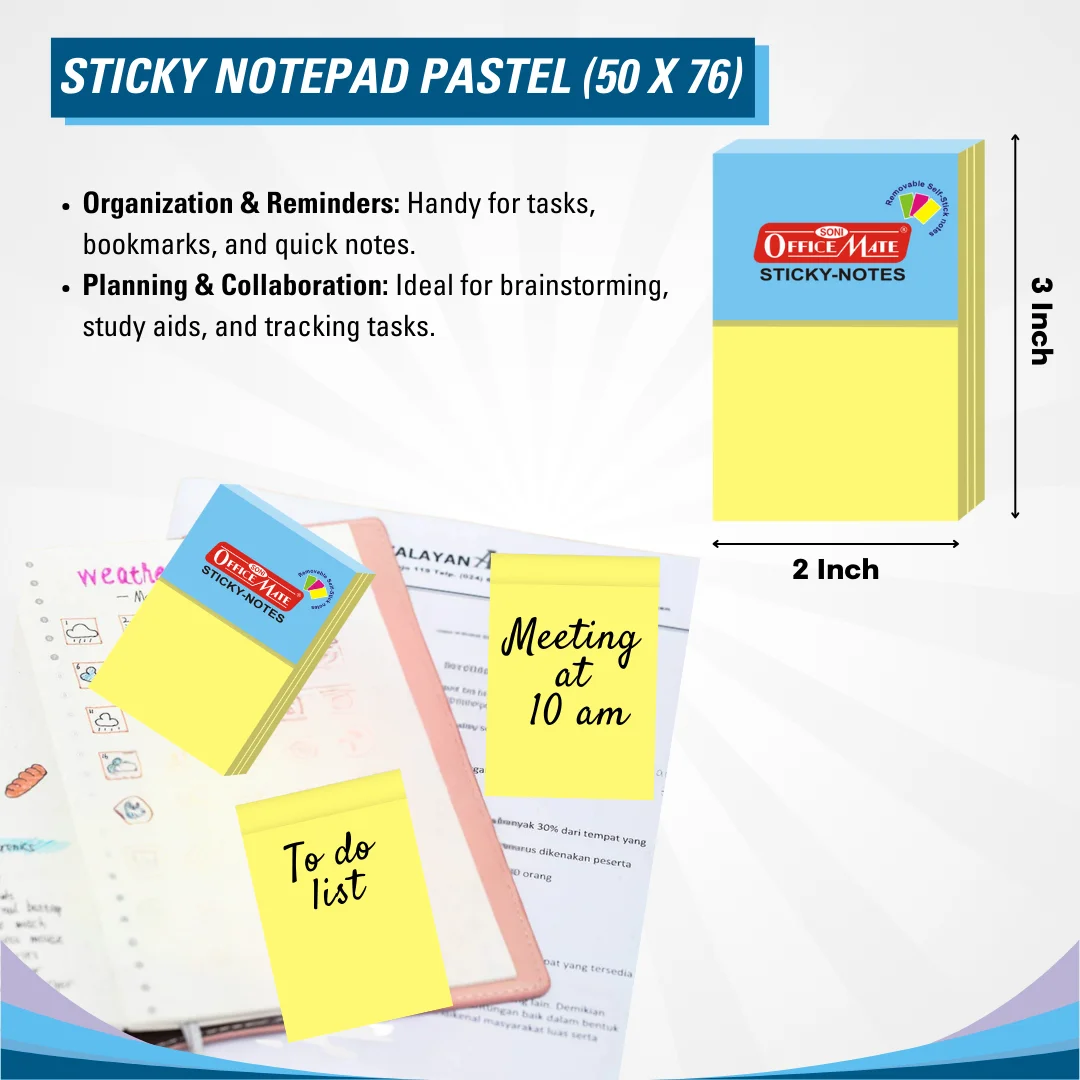 12. Sticky Notepad (50 mm x 76 mm): Pastel colors perfect for organization and reminders, ideal for tasks, bookmarks, quick notes, brainstorming, study aids, and tracking tasks.