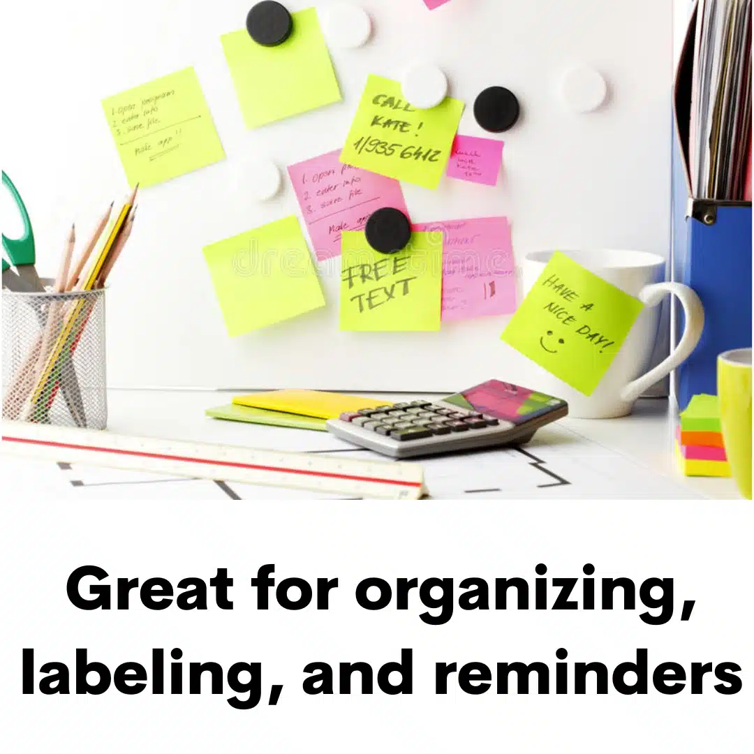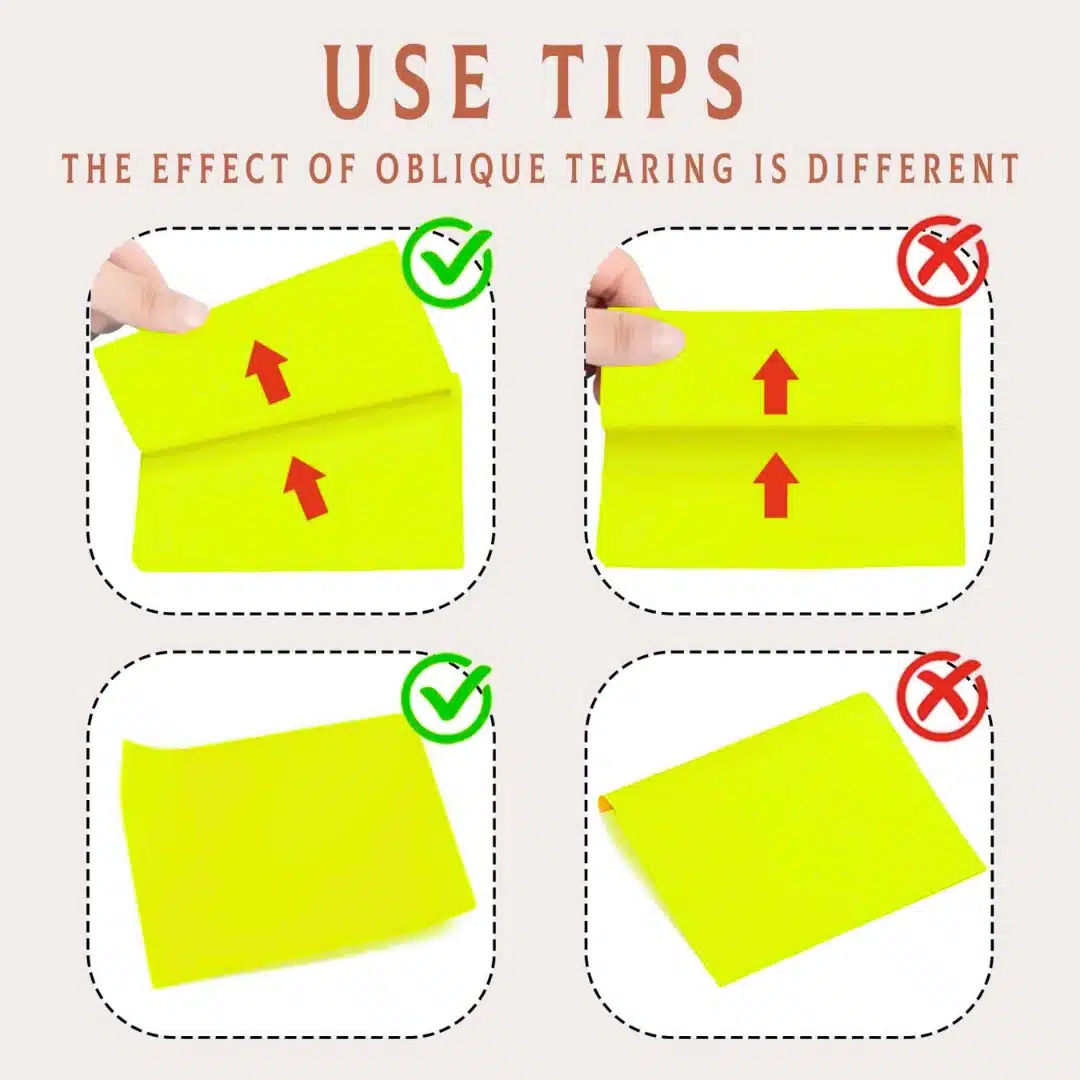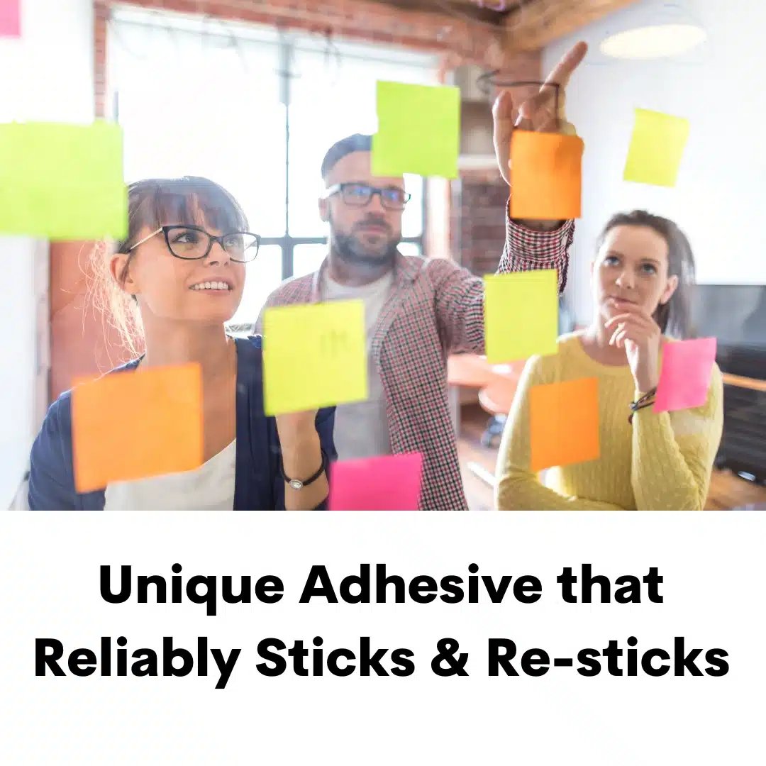 Our sticky notes' adhesive is soft enough to be repositionable while still being strong enough to adhere firmly to a range of surfaces, including paper, metal, wood, computer monitors, refrigerators, and more. A note will remain tacky and leave no residue if you stick it, peel it off, and stick it again a few times. They are made to remain on a dry, clean surface for days at a time.