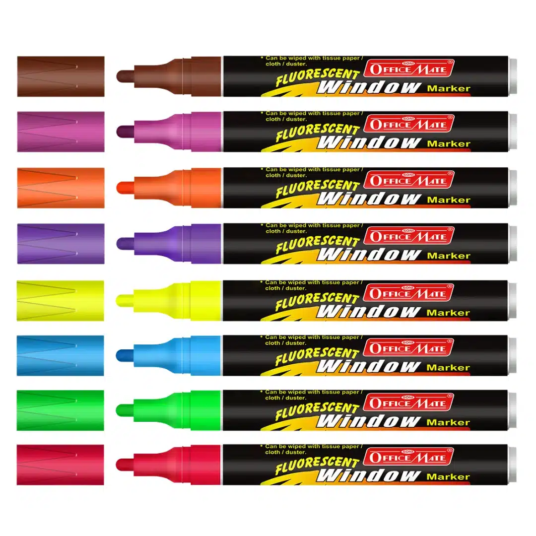 The Soni Officemate Window Marker 8pcs set offers a variety of vibrant colors for creative designs on windows and glass surfaces