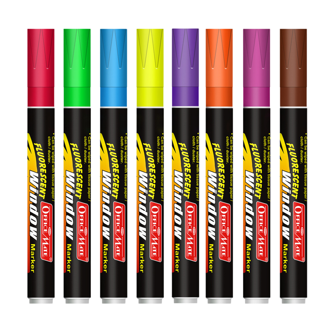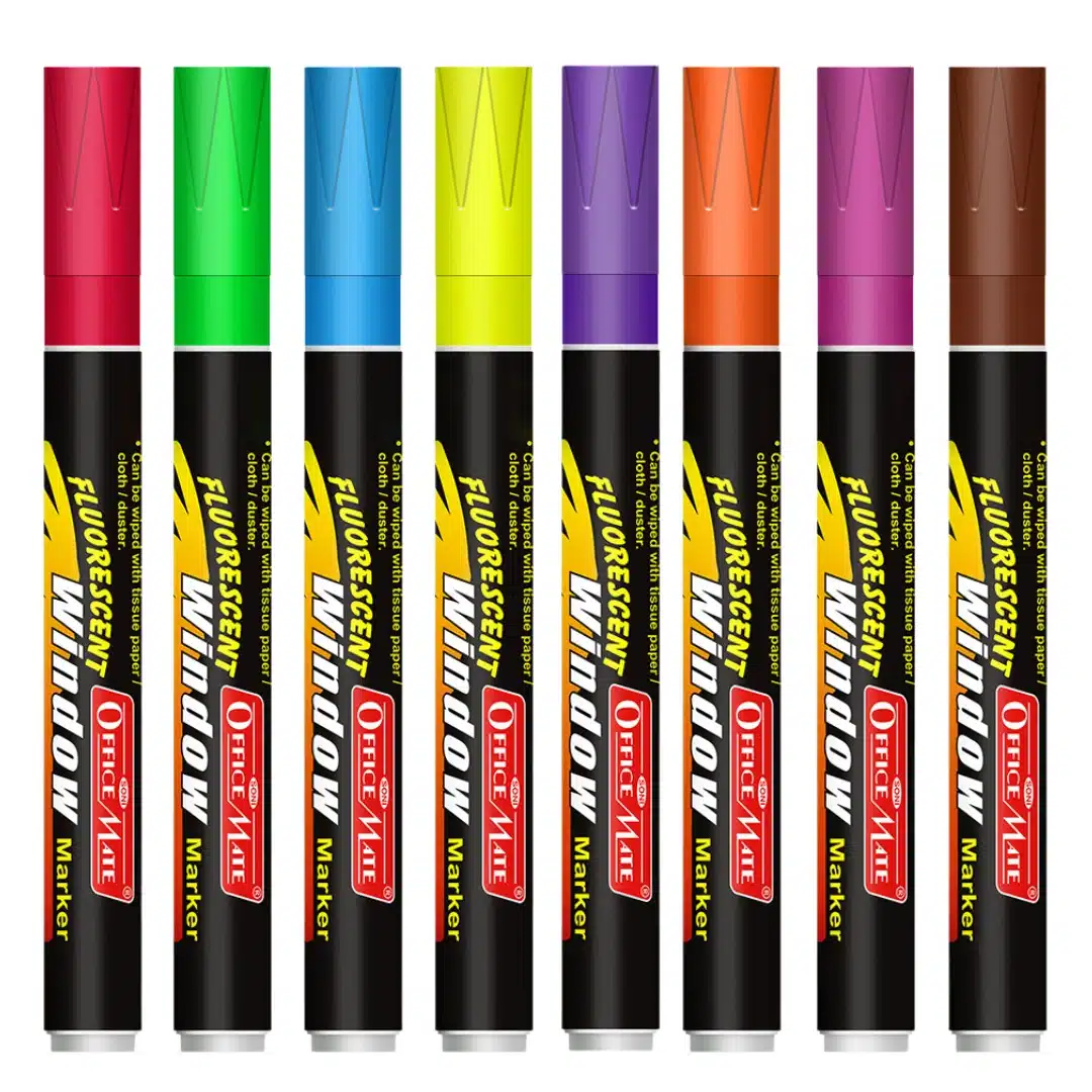 1. Fluorescent Window Marker (8 Pcs), features vibrant fluorescent colors: Red, Blue, Green, Orange, Yellow, Brown, Violet, and Magenta.