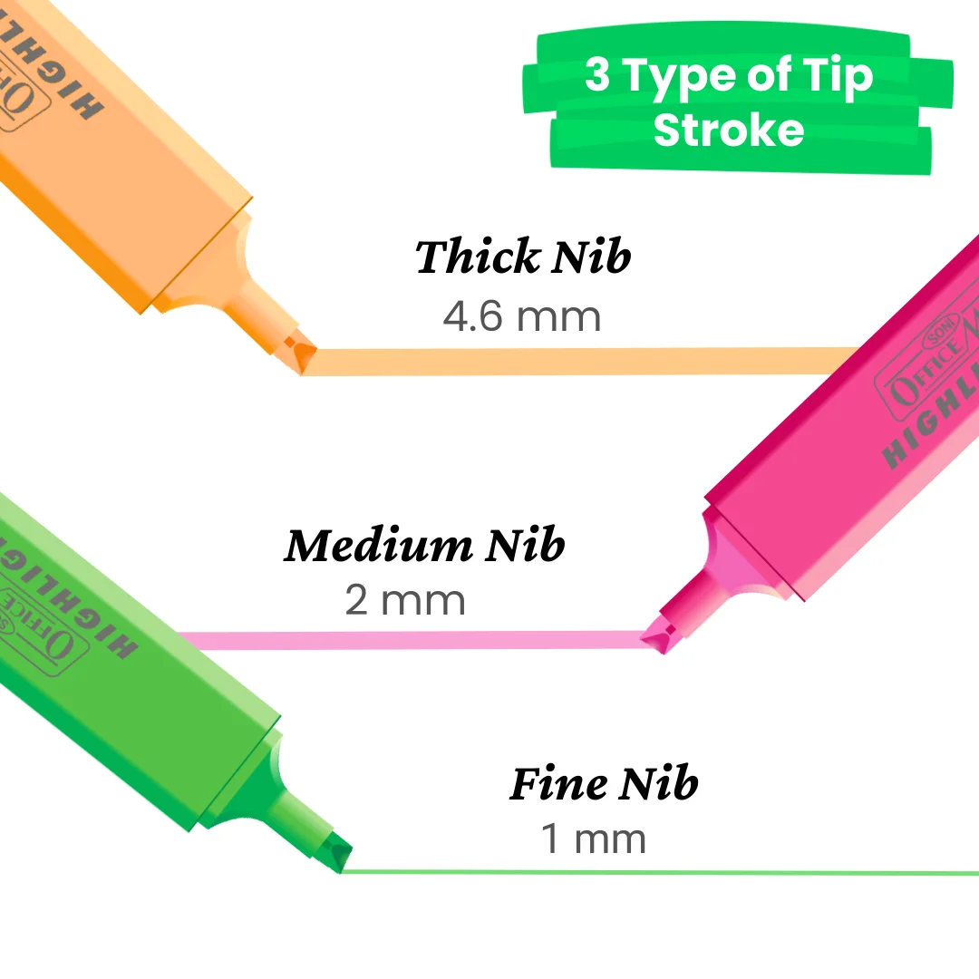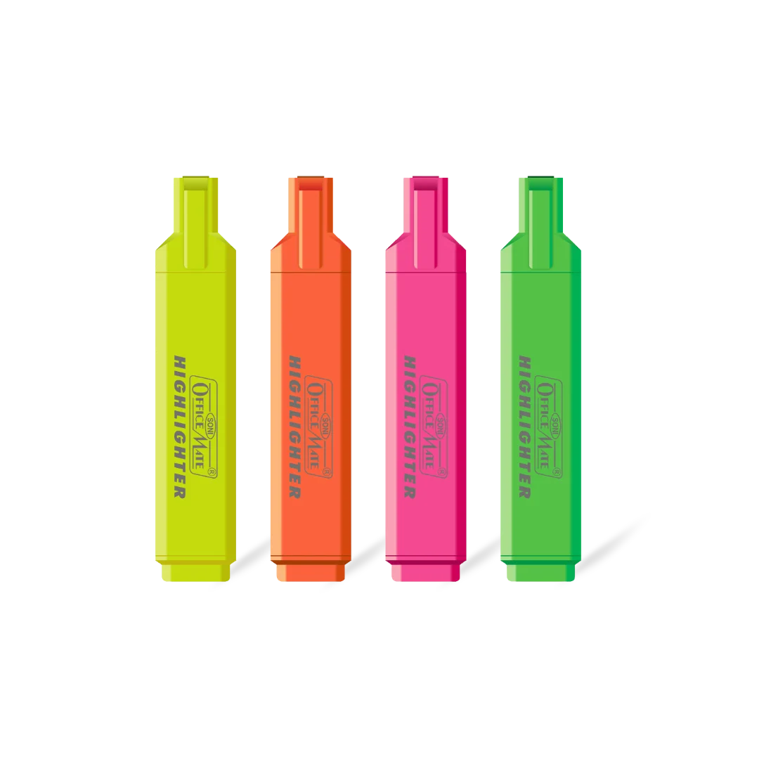 We have options for both pastel and fluorescent colours. Six bright fluorescent colours (for that bright neon look) and six gentle pastel colours are included in our standard set. Regardless of your preference for soft pastel hues or striking neon highlights, you can select the Soni Officemate highlighter pack that best fits your look.
