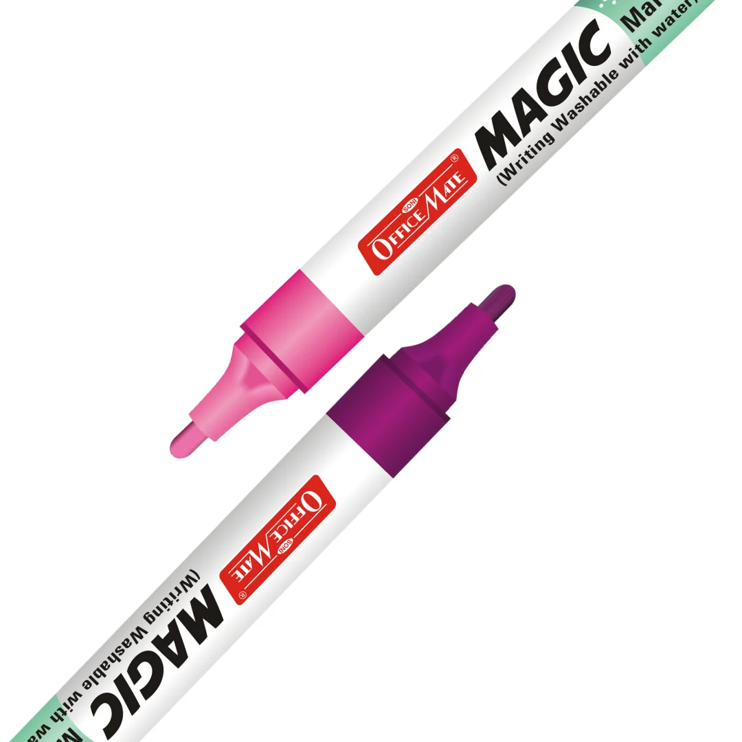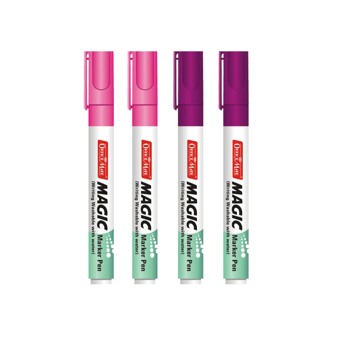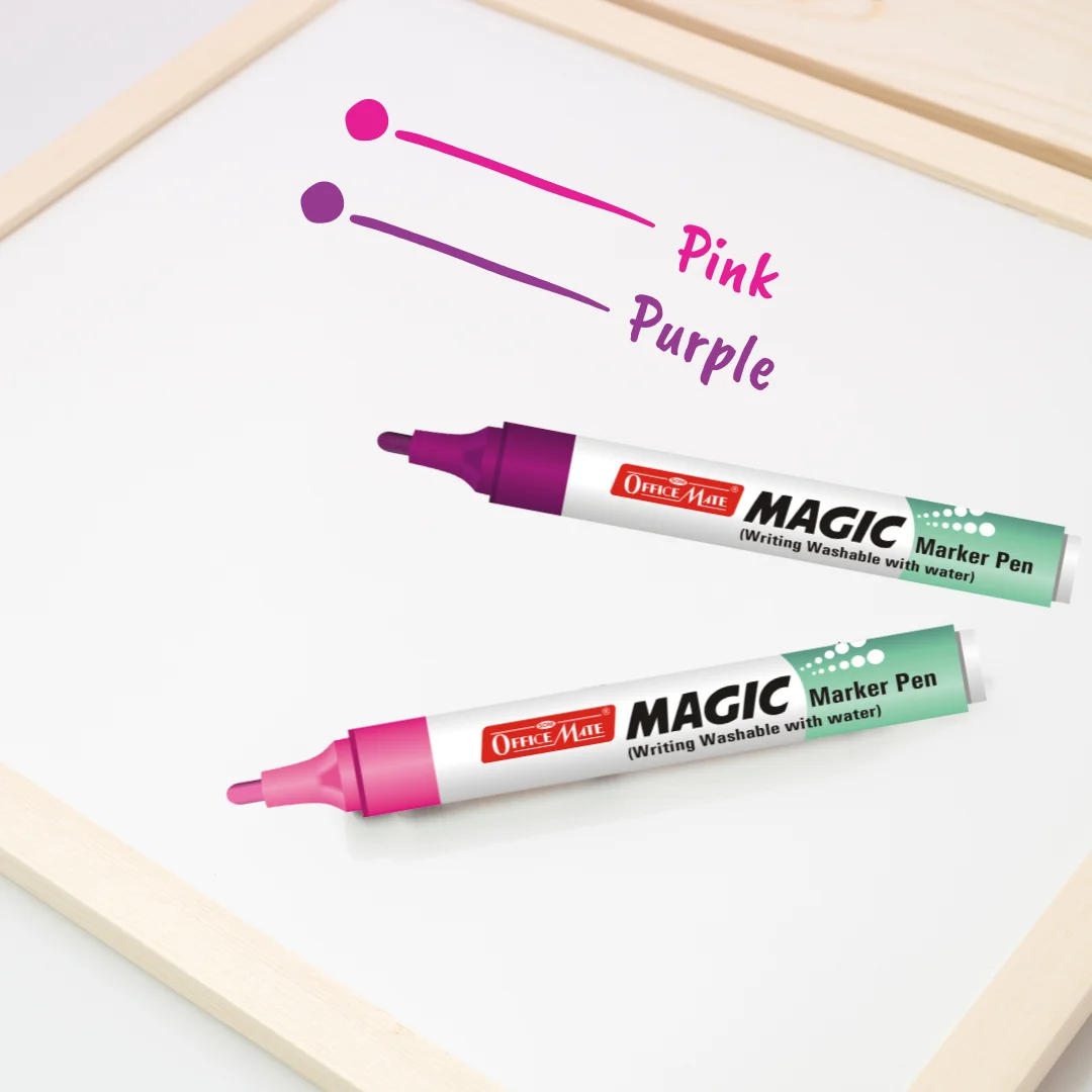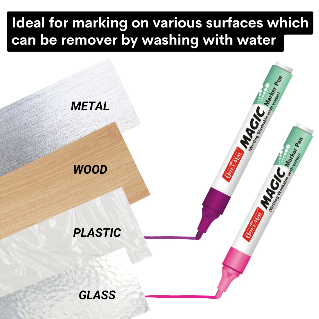 Soni OfficeMate Magic Markers in purple and pink deliver vibrant, temporary markings that easily wash off with water. Perfect for use on various surfaces like wood, glass, metal, whiteboard, and plastic, these markers are ideal for projects that require easily removable ink. The pack includes four markers, making them versatile tools for both creative and practical applications.