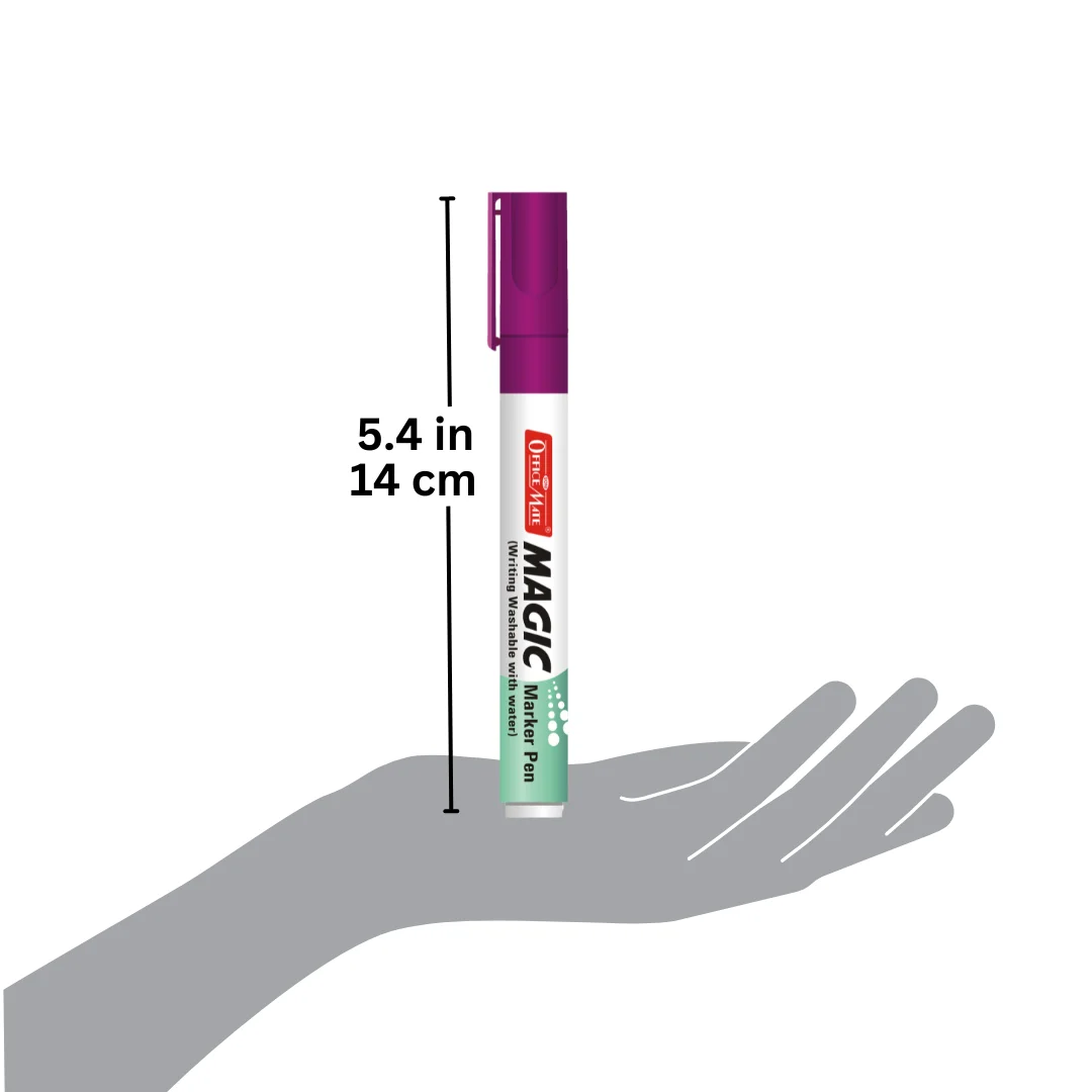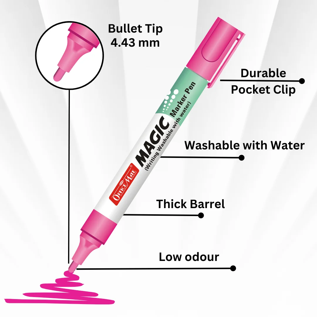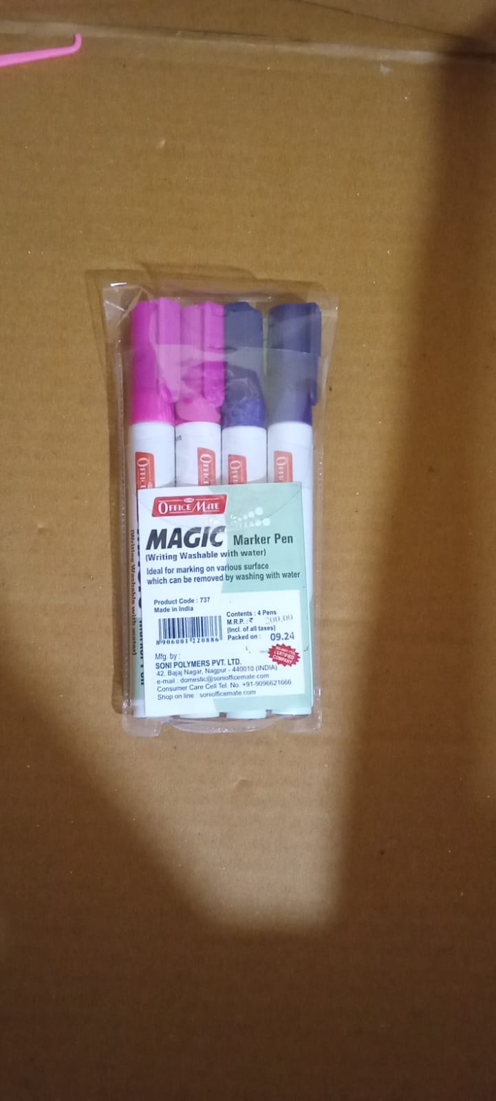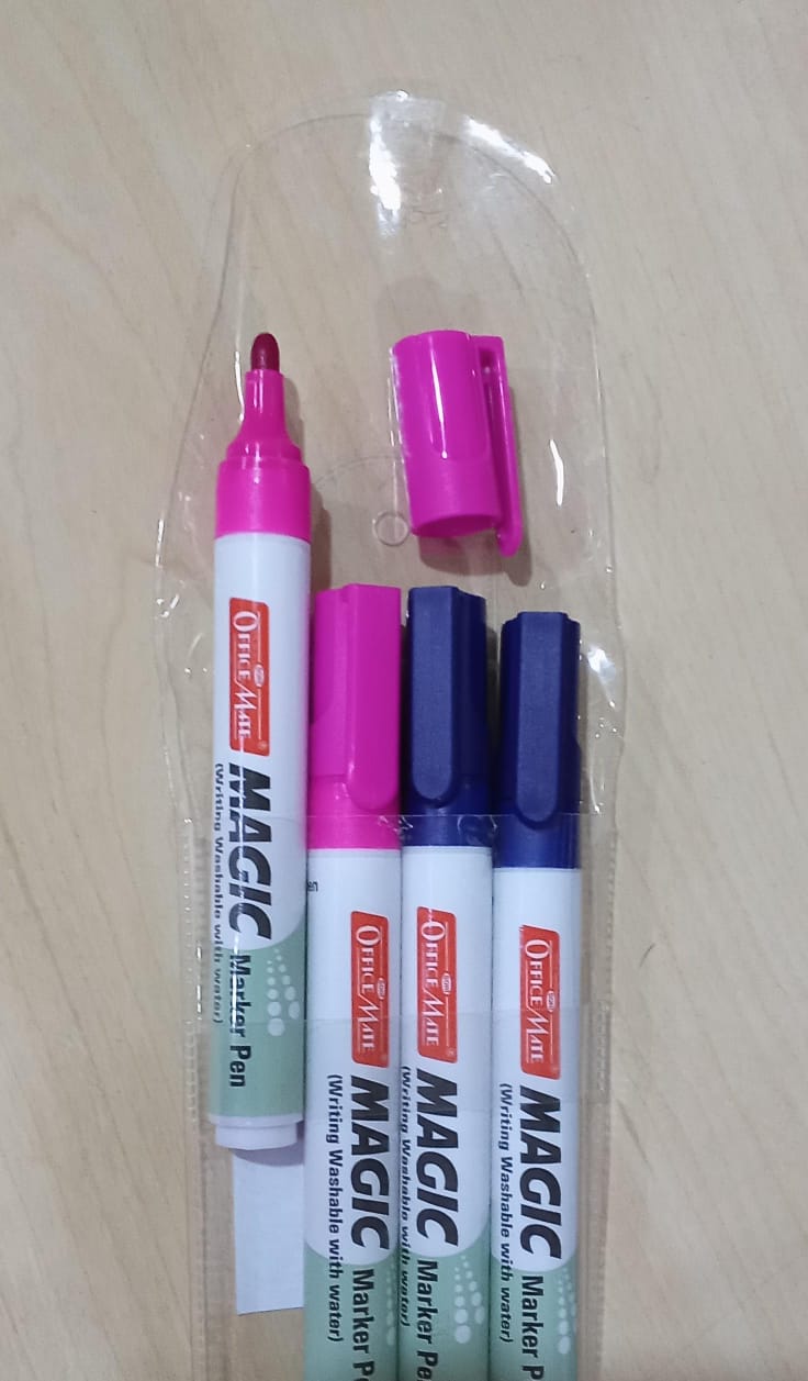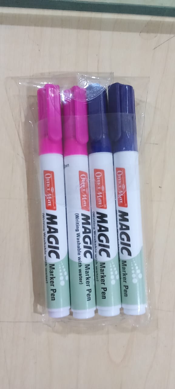 Soni OfficeMate Magic Markers in purple and pink deliver vibrant, temporary markings that easily wash off with water. Perfect for use on various surfaces like wood, glass, metal, whiteboard, and plastic, these markers are ideal for projects that require easily removable ink. The pack includes four markers, making them versatile tools for both creative and practical applications.
