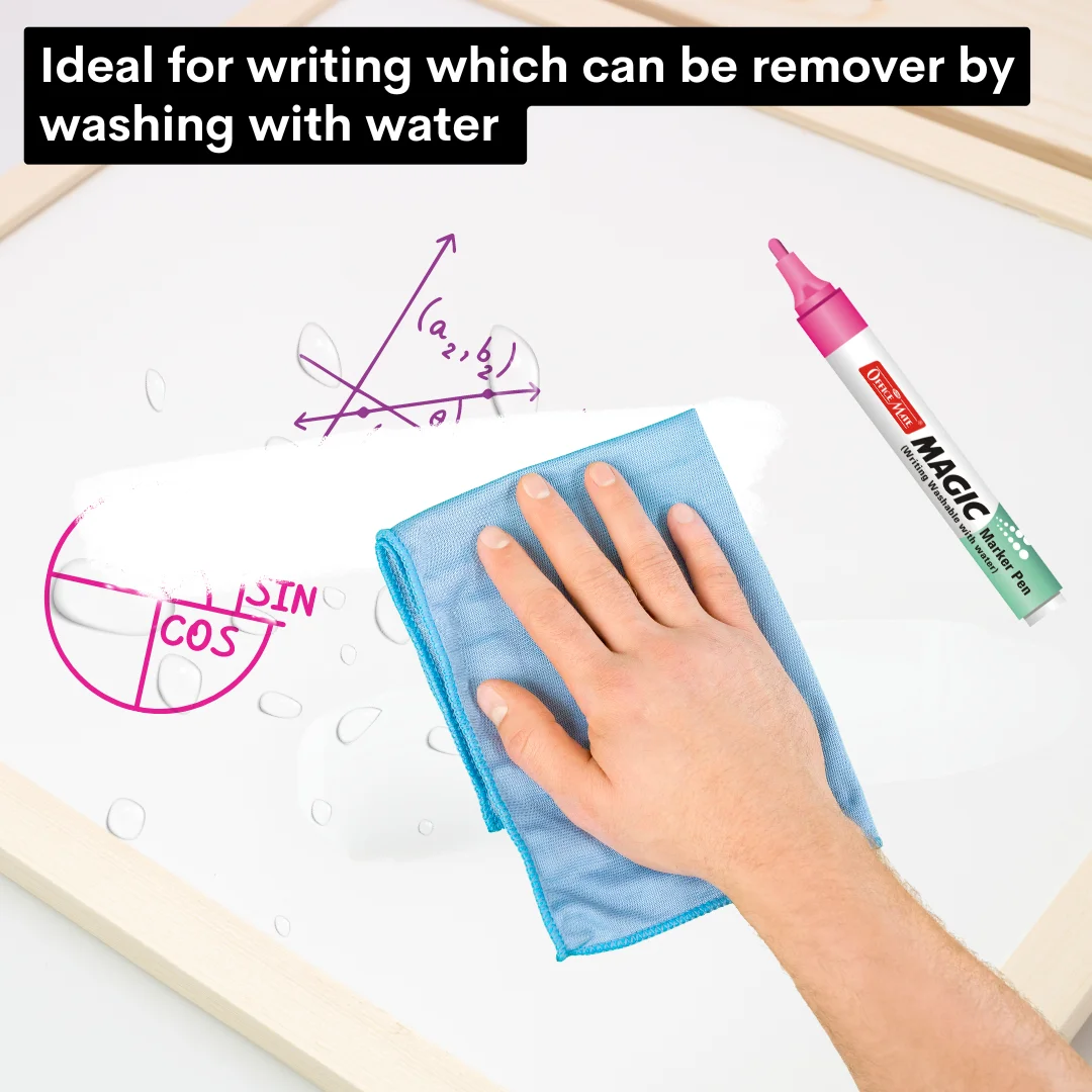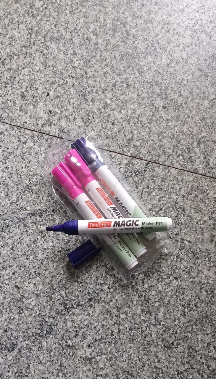 The Magic Marker Pens are special because they are water-washable and come in bright colors. “Water-washable” means if you draw on a whiteboard, window, or accidentally on clothes or skin, you can easily wash the ink off with just water. They are eco-friendly, using safe ingredients, and the vivid inks make your drawings stand out. It’s like having a set of magic crayons that are bold but also easy to clean up; they’re great for creative projects and kids’ art.