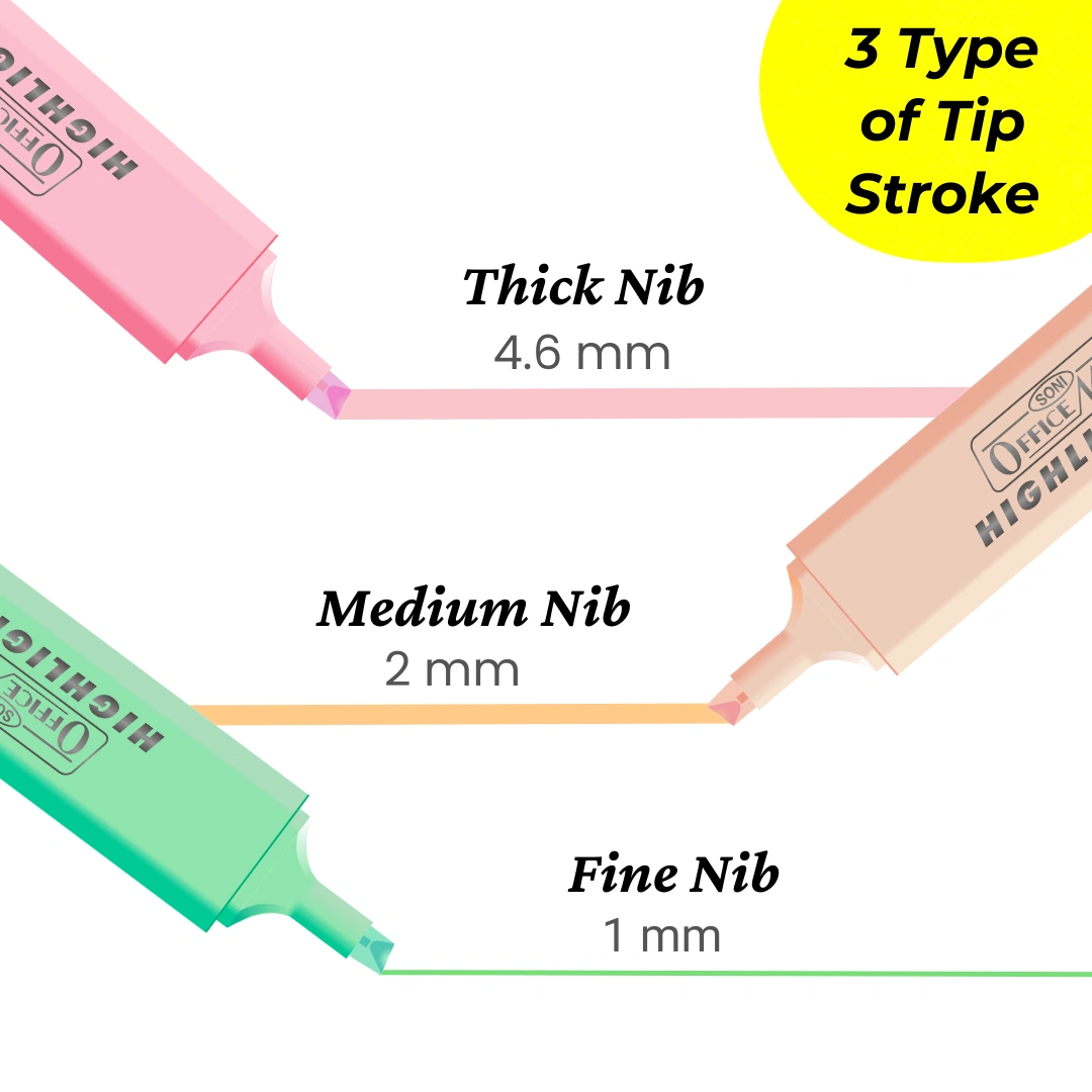 4. Type of Tip Stroke: The chisel tip offers versatile line widths—Thick Nib: 4.6 mm, Medium Nib: 2 mm, Fine Nib: 1 mm—ideal for both broad and precise highlighting.