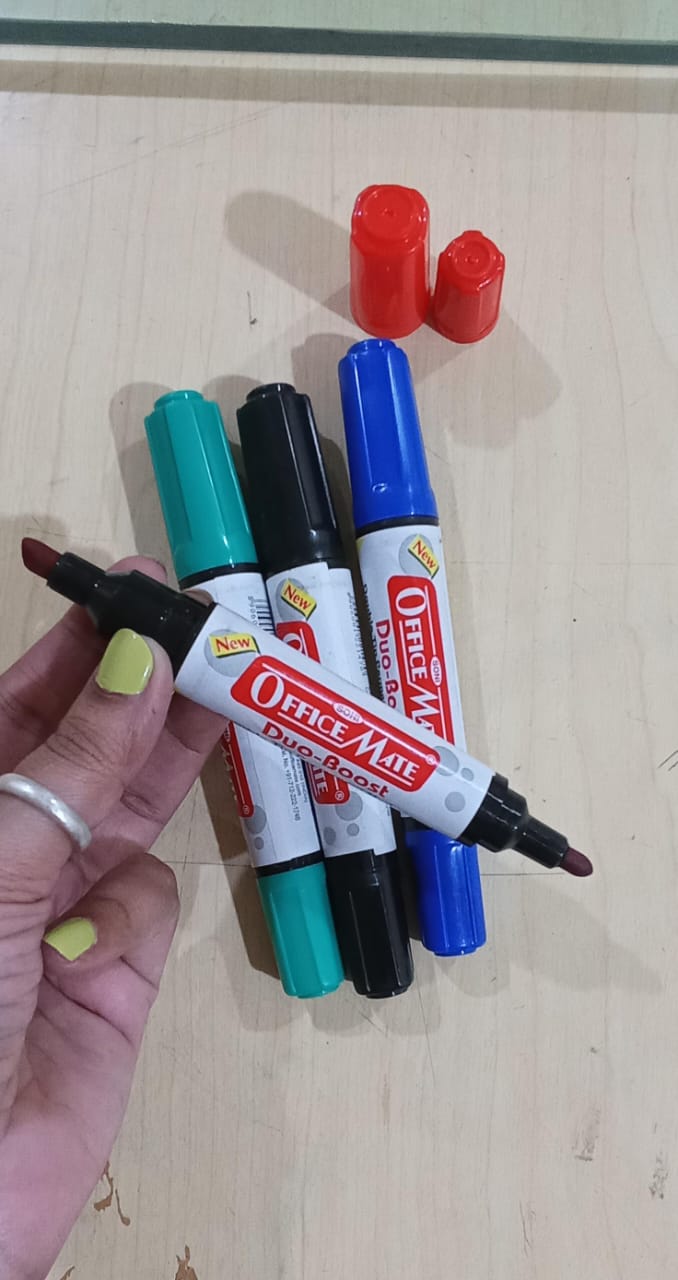 Soni OfficeMate Permanent Markers feature a dual-tip design with bullet and chisel tips for versatile use. This pack of four includes vibrant colors—black, blue, red, and green—perfect for writing, labeling, and creative tasks. The quick-drying, fade-resistant ink ensures long-lasting, smudge-free results on various surfaces. Ideal for both office and creative environments.
