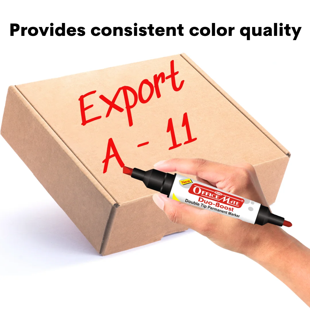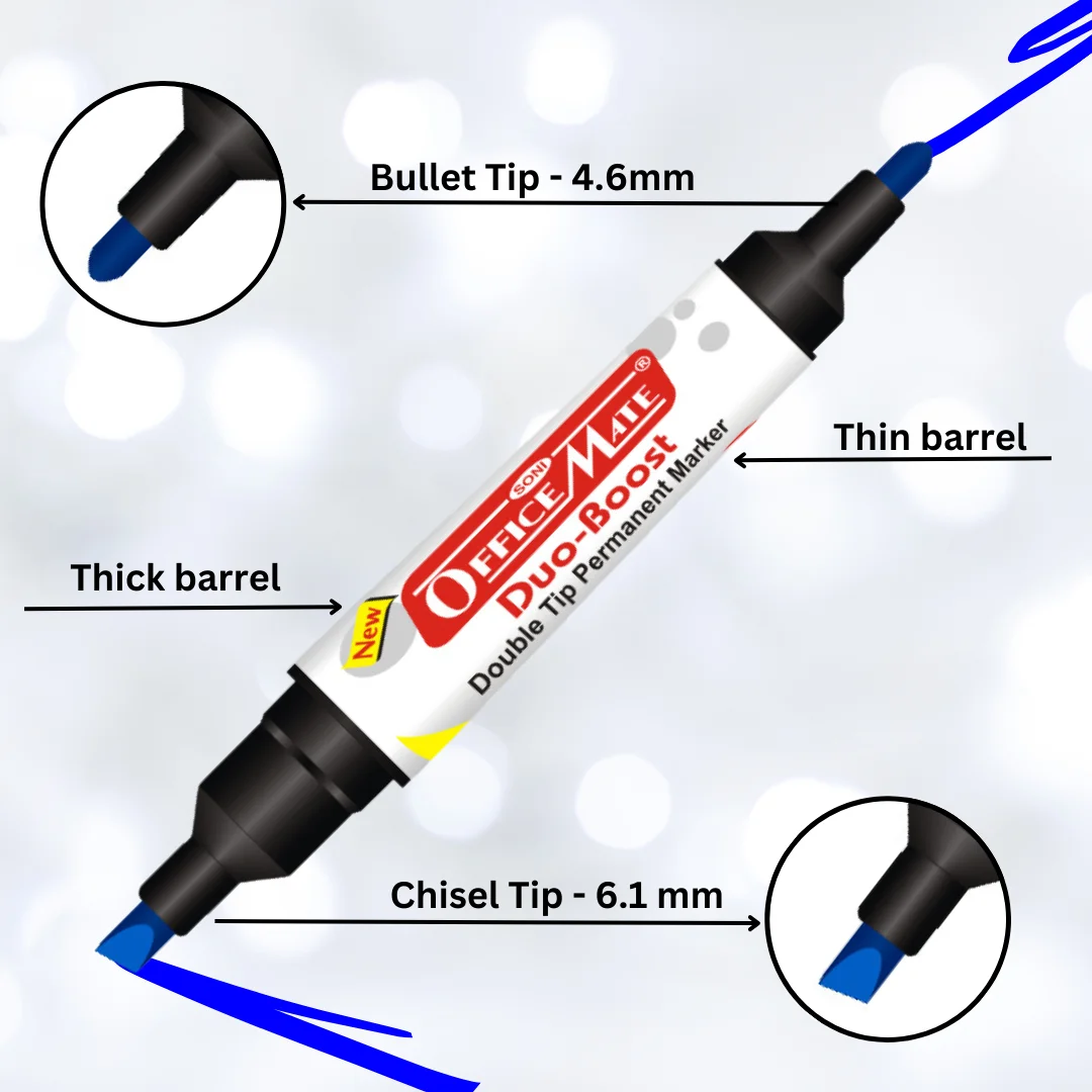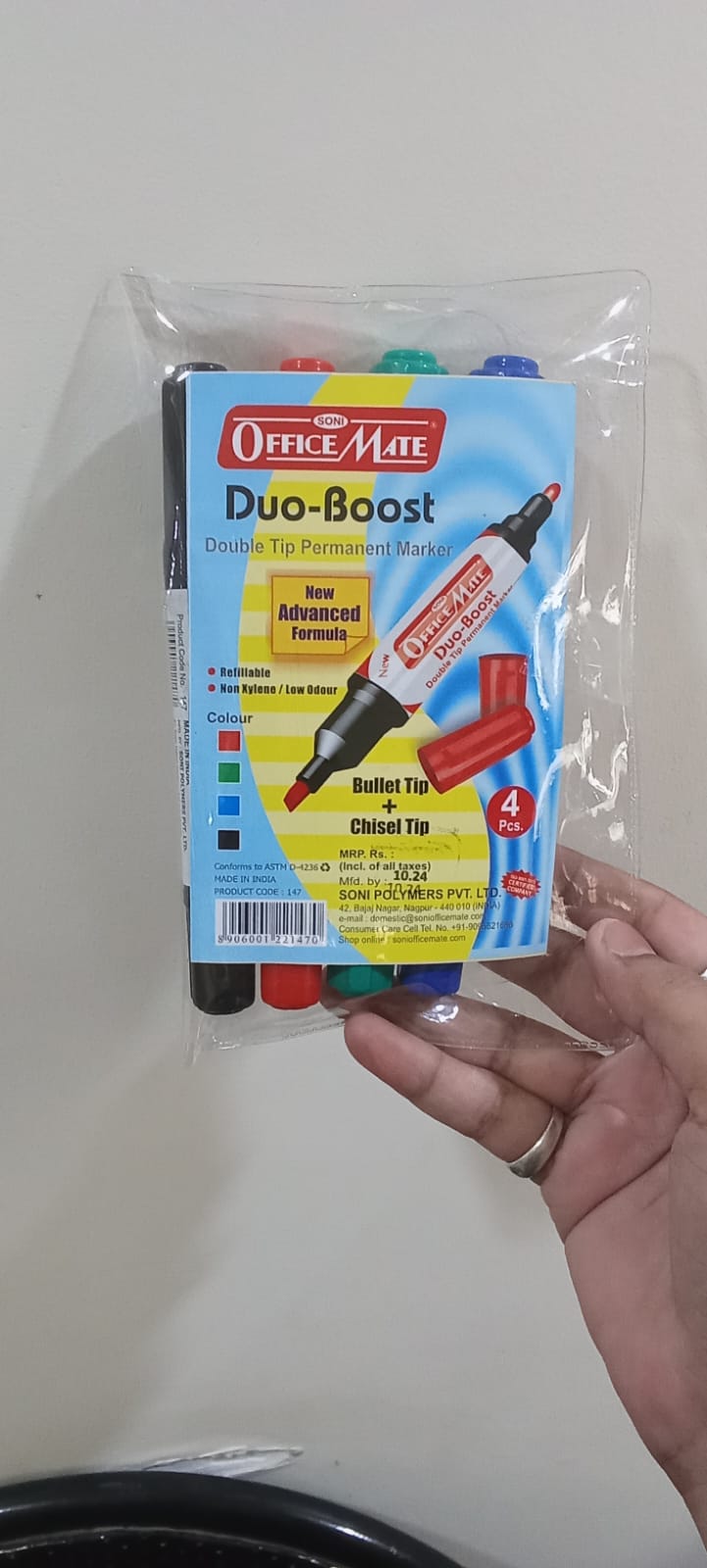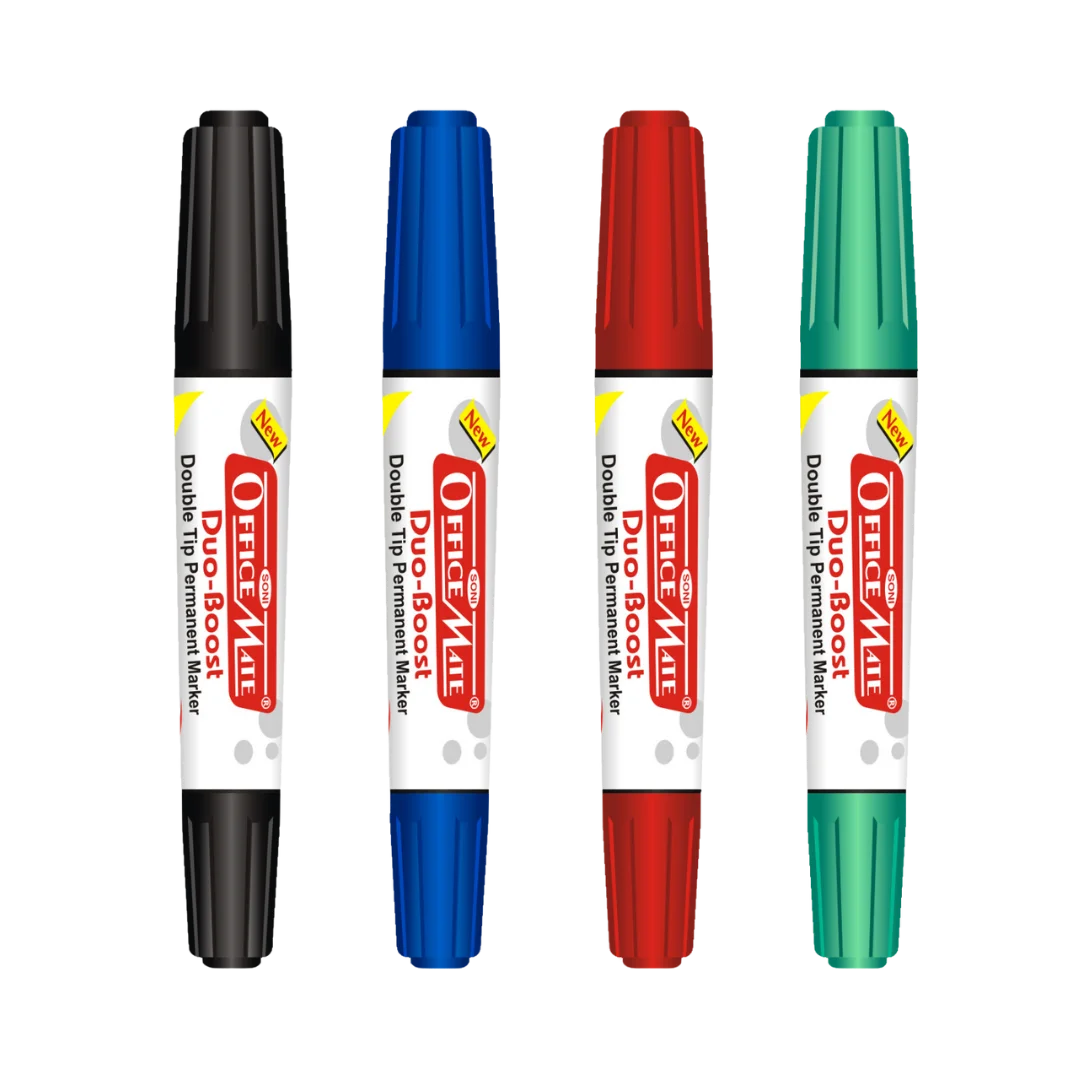 Soni OfficeMate Permanent Markers feature a dual-tip design with bullet and chisel tips for versatile use. This pack of four includes vibrant colors—black, blue, red, and green—perfect for writing, labeling, and creative tasks. The quick-drying, fade-resistant ink ensures long-lasting, smudge-free results on various surfaces. Ideal for both office and creative environments.