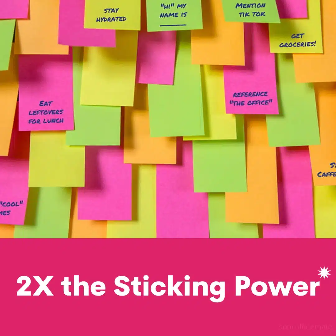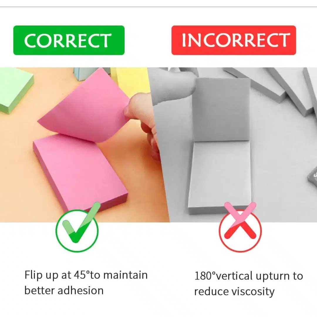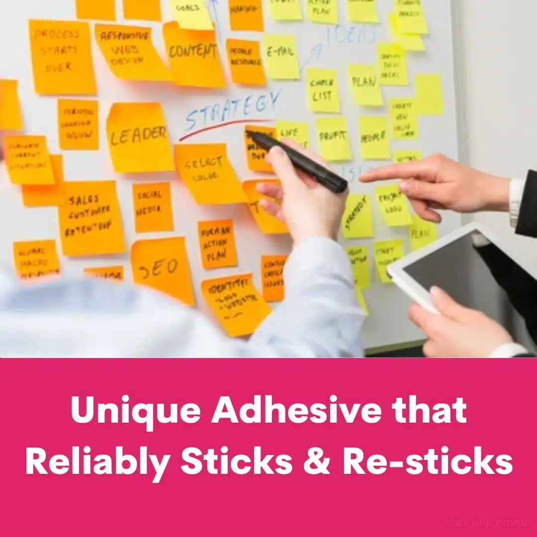 Our sticky notes' adhesive is soft enough to be repositionable while still being strong enough to adhere firmly to a range of surfaces, including paper, metal, wood, computer monitors, refrigerators, and more. A note will remain tacky and leave no residue if you stick it, peel it off, and stick it again a few times. They are made to remain on a dry, clean surface for days at a time.