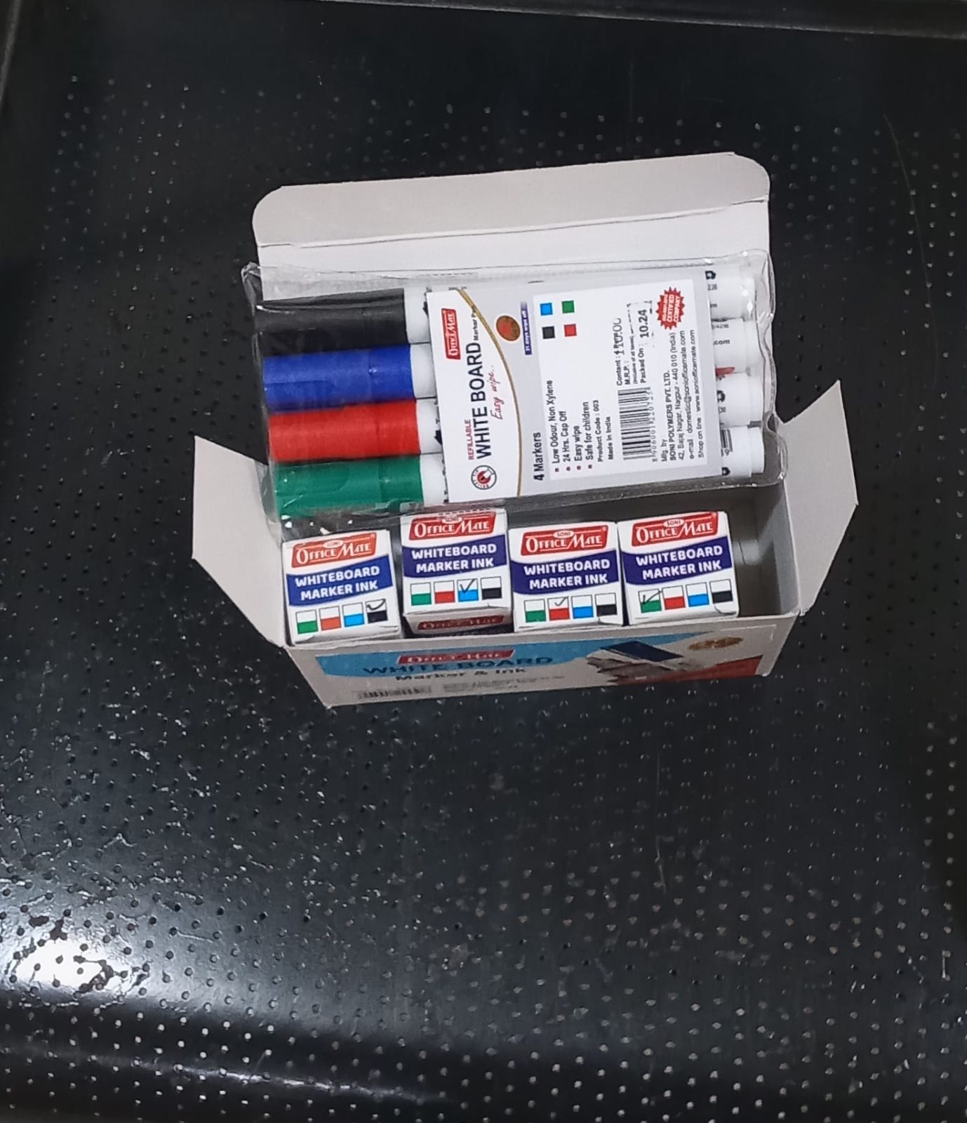 Typically, the set comes with four distinct coloured markers. Standard whiteboard colours are black, blue, red, and green, and you usually get a set of these markers. There is an identical refill ink bottle for every marker. This allows you to write on the board while enjoying a range of colours. When a marker runs low, it's simple to replace it with the appropriate colour.