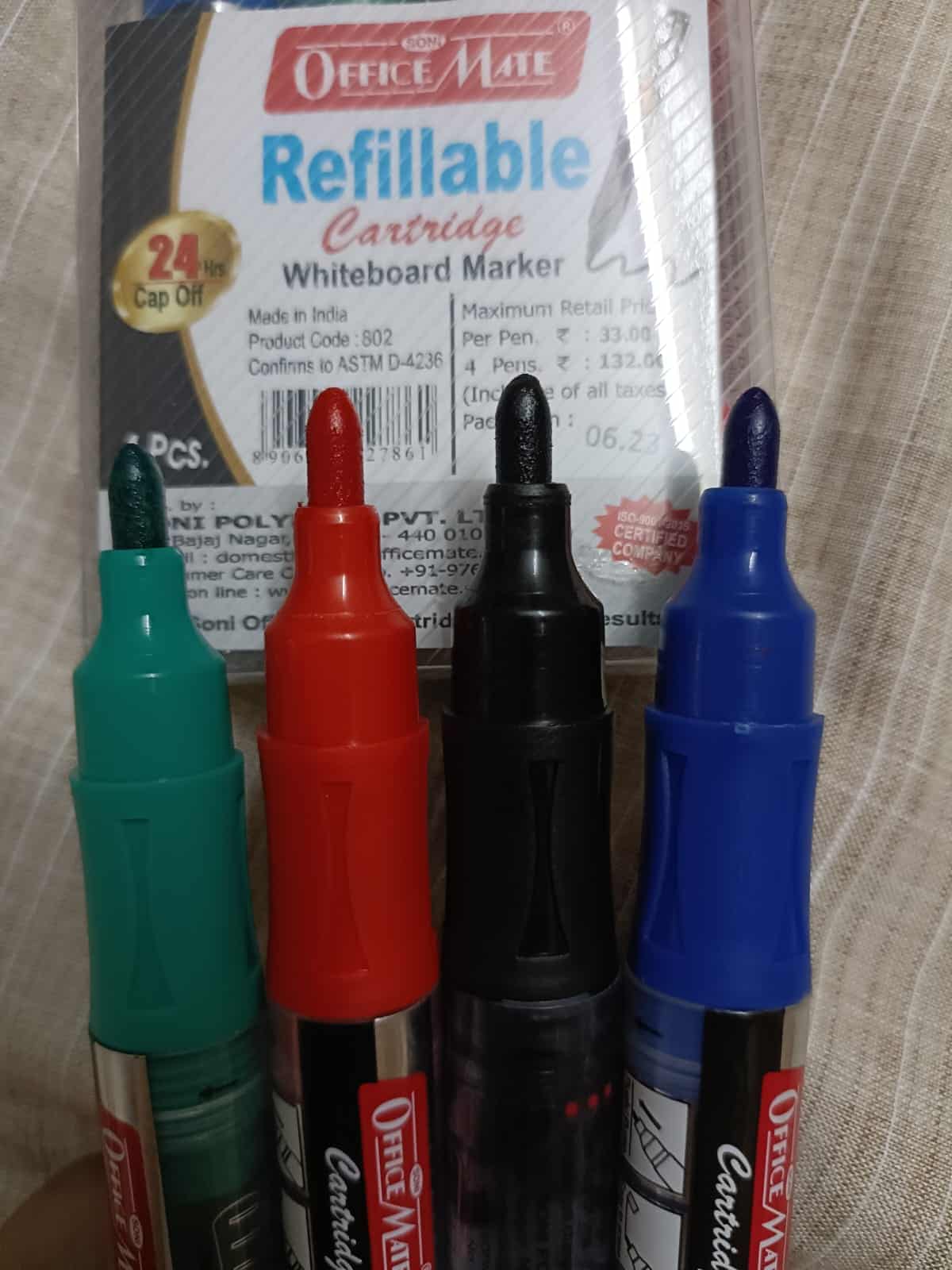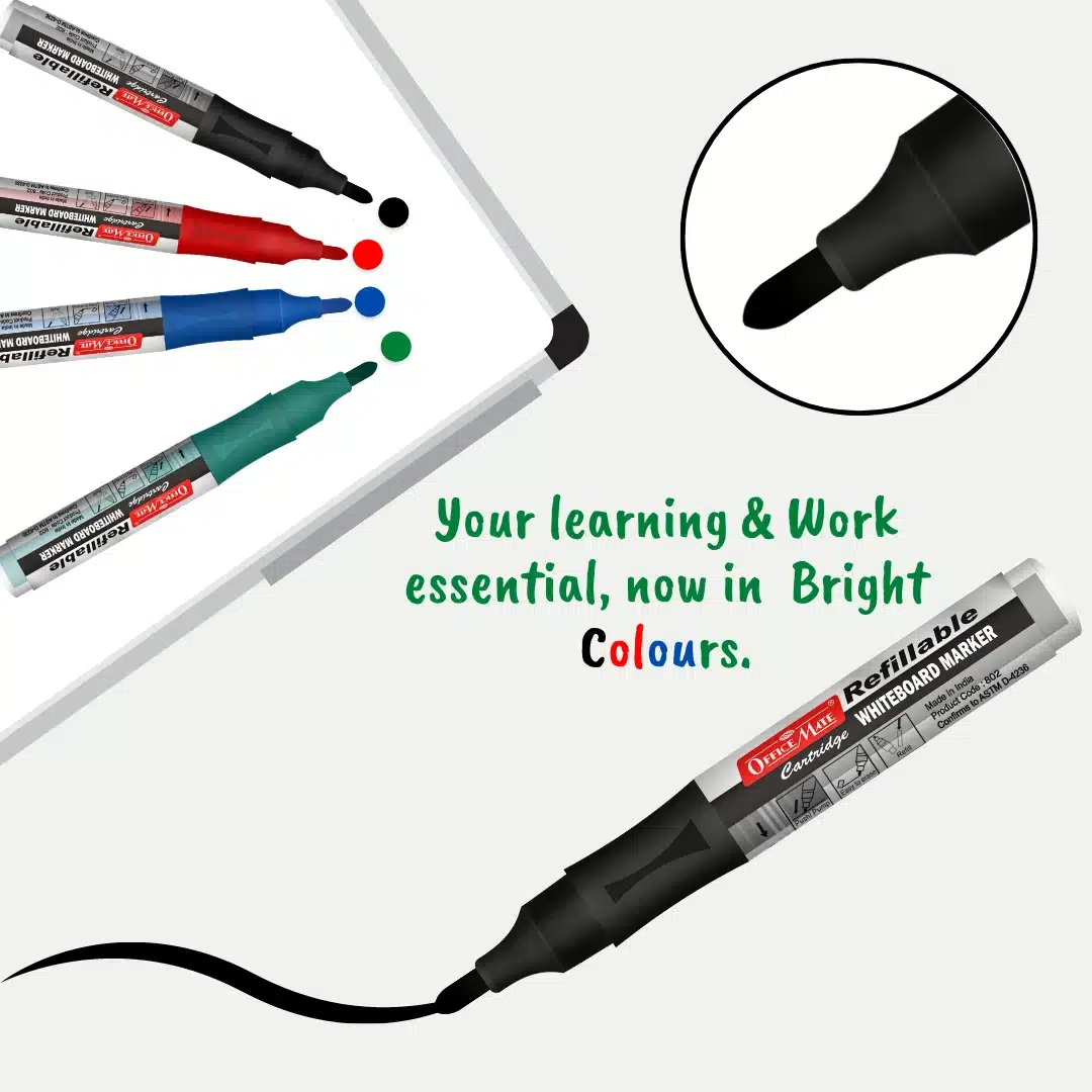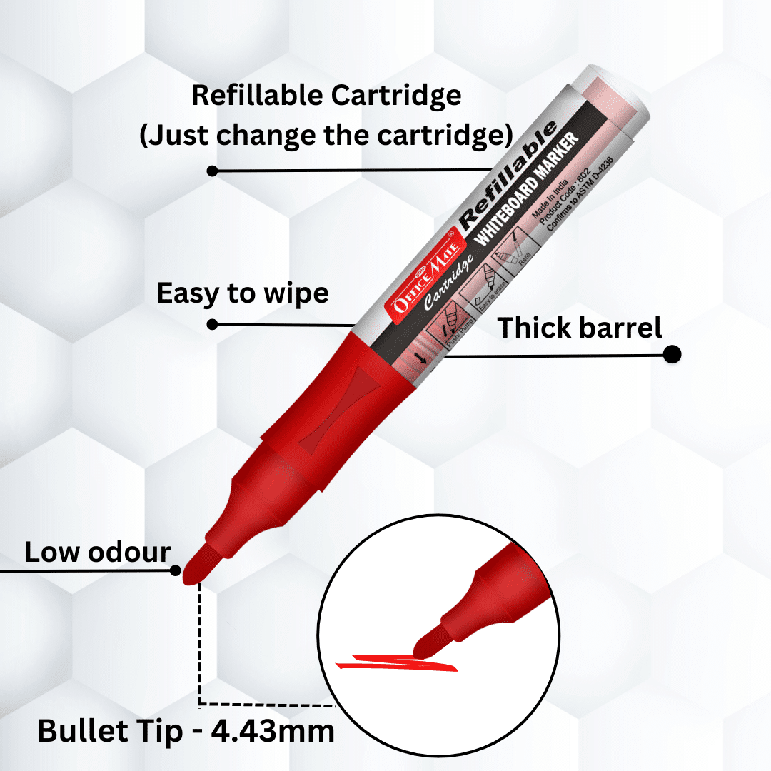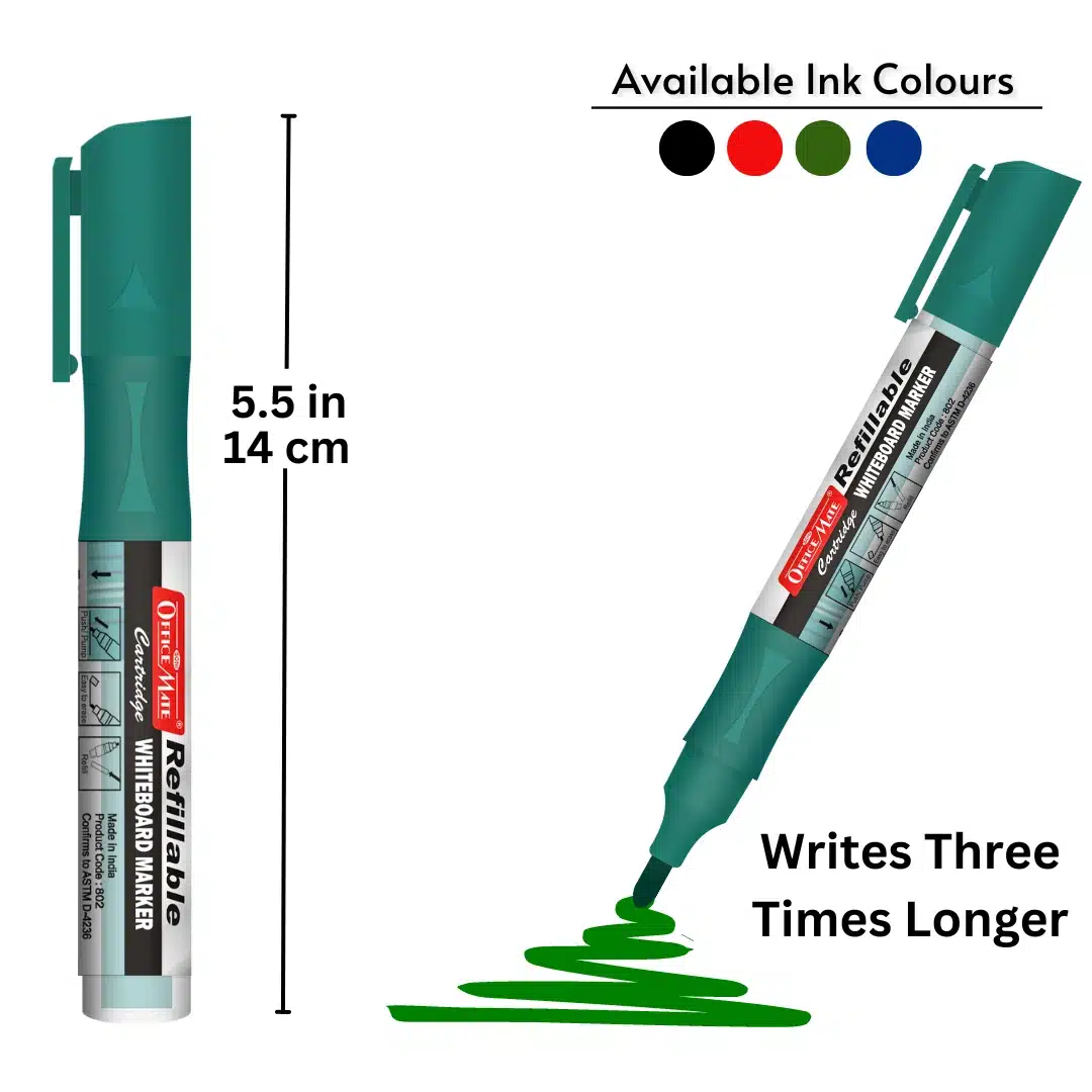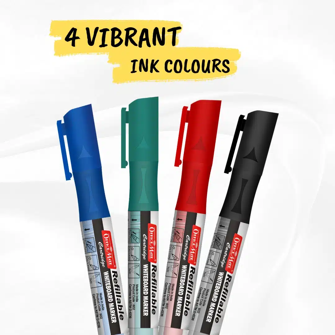 DESCRIPTION -And here comes our new product – Markers with plug-in cartridges, make a mark on what you present in offices, schools, hospitals, etc. The marker is specially designed so that your words are emphasized not just on whiteboards, but on various other surfaces; when you need to erase it, it comes off easily. It’s refillable – change the cartridge. However, with a high cap-off time, the refilling parameter is as good as obsolete for the marker. Our inks have a long shelf life. Includes cartridge with 3ml ink. To start, pump 10 times and wait for the ink flow. Refillable Cartridge whiteboard marker in a pack of 4 pcs.