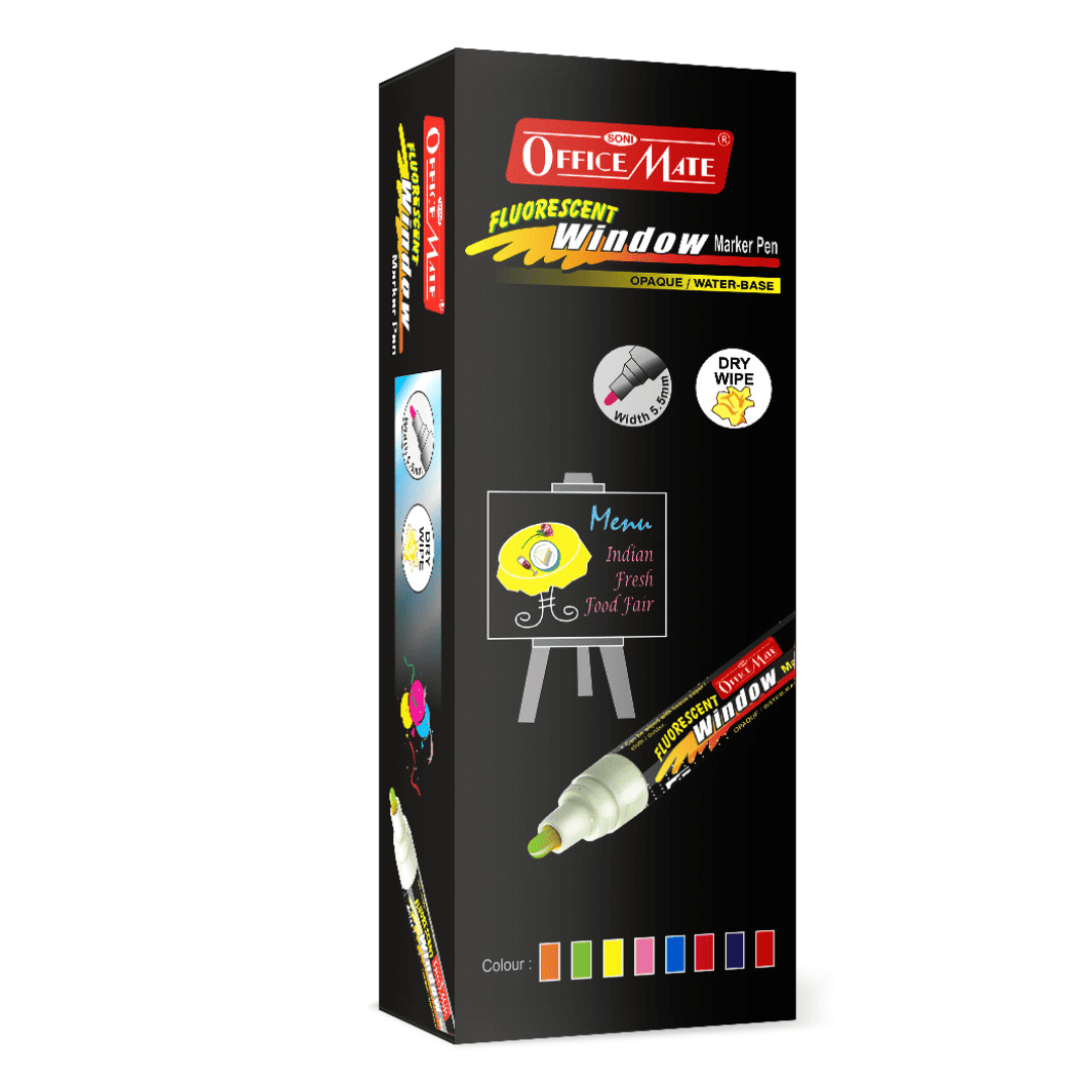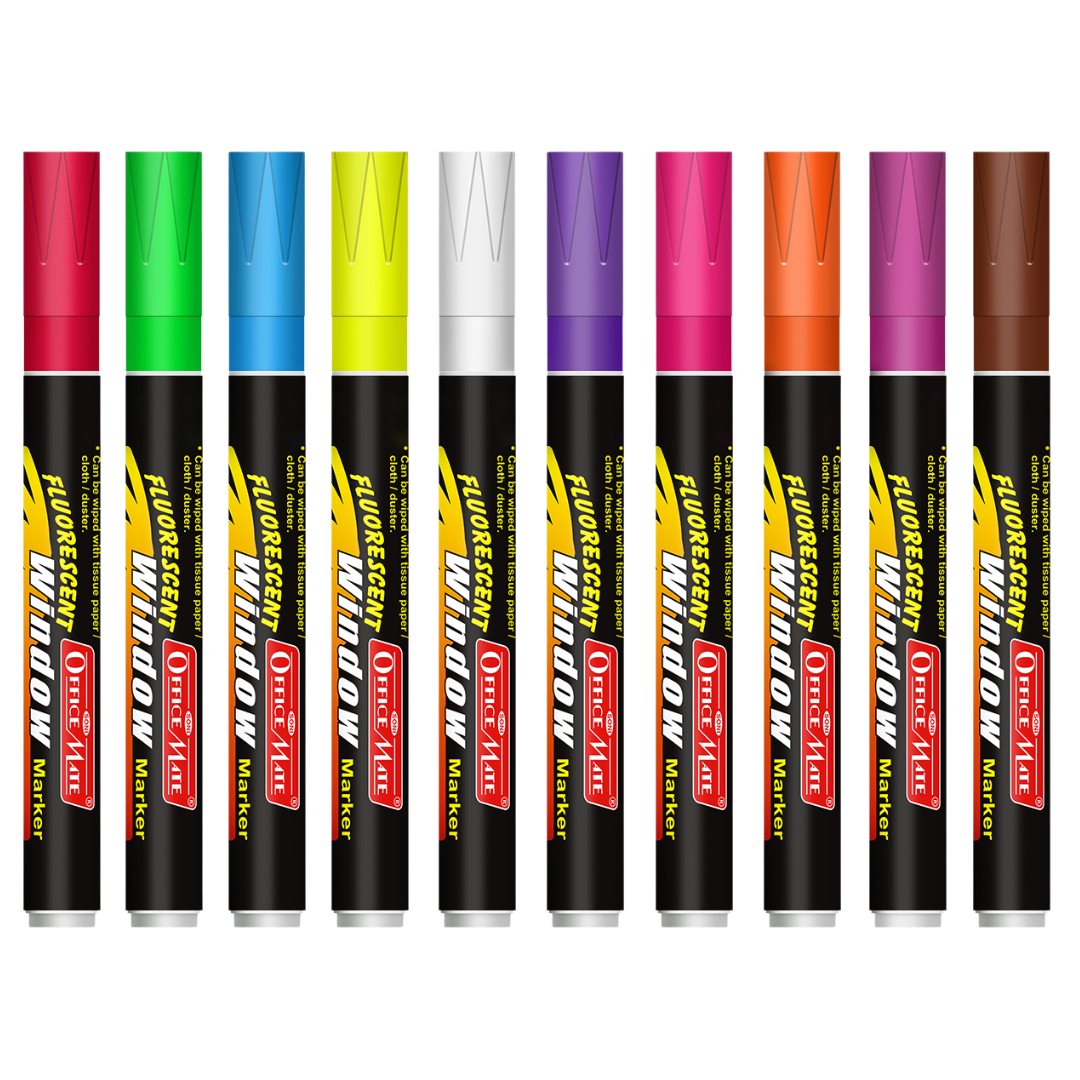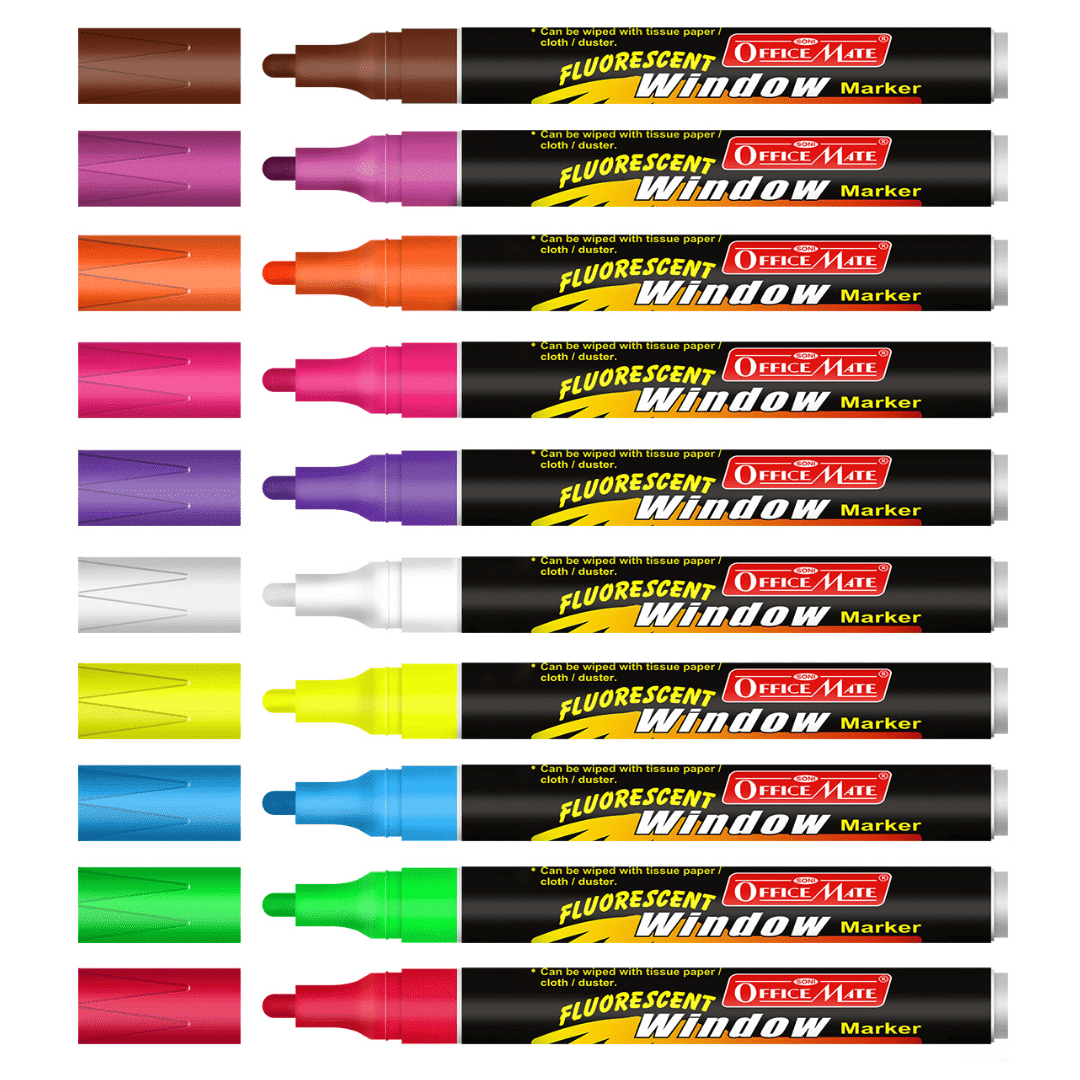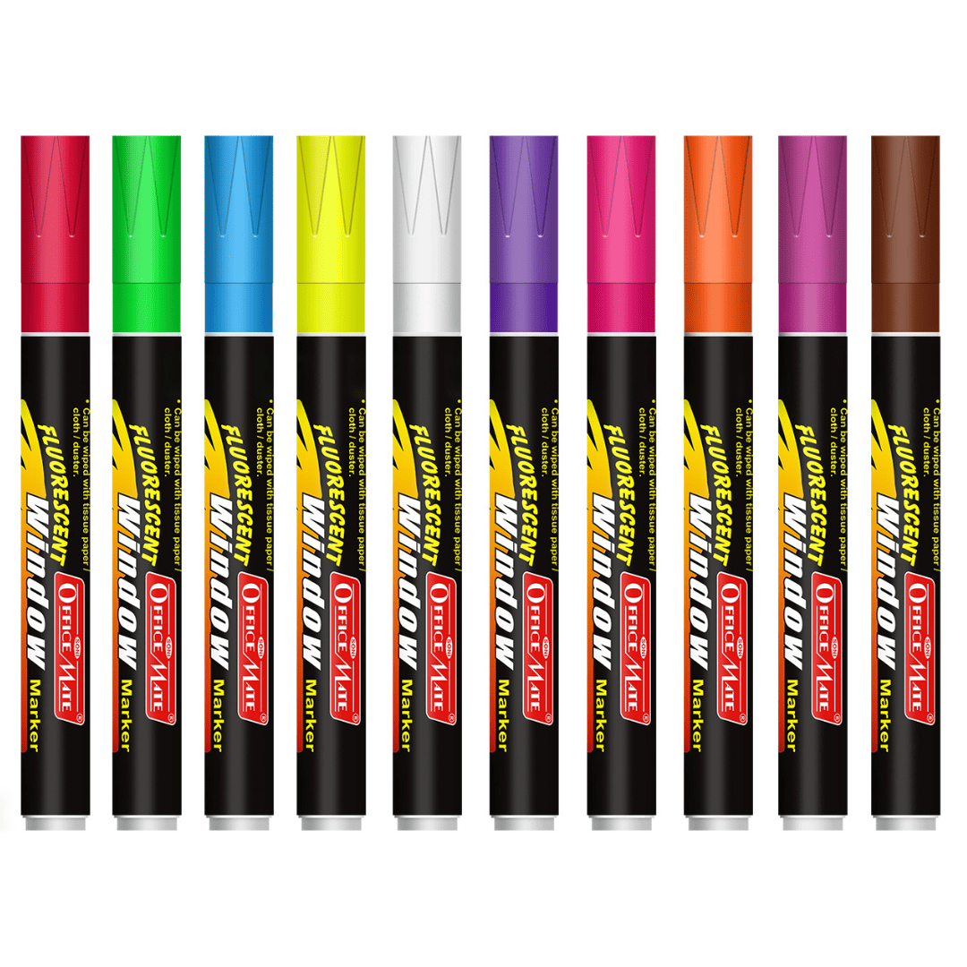 1. Fluorescent Window Marker/Chalk Marker (10 Pcs), features vibrant fluorescent colors: Red, Blue, Green, White, Orange, Pink, Yellow, Brown, Violet, and Magenta.