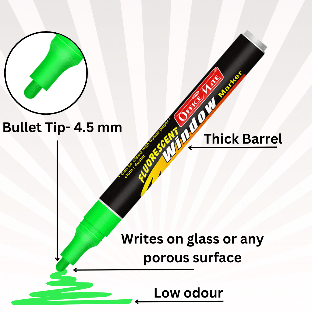We offer window markers in a variety of vibrant, eye-catching colors that show up beautifully on glass surfaces. Popular shades include white (great for dark-tinted car windows), neon yellow, neon green, neon orange, red, blue, and pink. These fluorescent colors really pop, especially in sunlight, making your messages or designs stand out. Some sets also include black for outlining or adding contrast. All of our window marker colors are easy to wipe off and completely washable from glass. Using multiple colors makes your window art or signage even more attention-grabbing and fun!