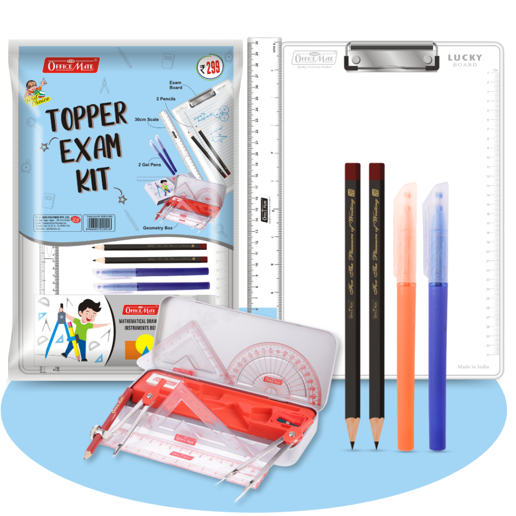 • Topper Exam Kit – Designed for exam success, this kit includes a transparent exam board, 30 cm scale, 2 pencils, 2 pens, and a geometry box.
