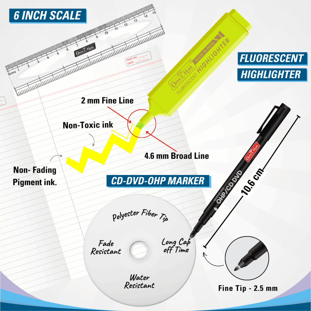 • Deskmate Kit – Ideal for students, this compact kit offers 2 gel pens, 2 pencils, 1 highlighter, 1 eraser, 1 sharpener, and a 6-inch scale.